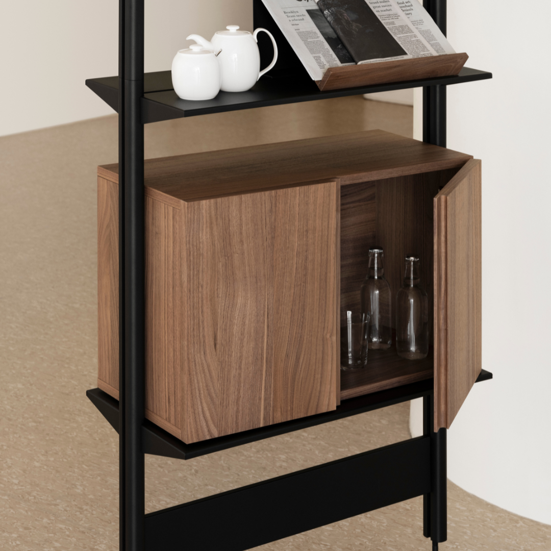 The metalwork of the Pira G2 is timeless, the bookends and cupboards made of walnut and white oak give a homely atmosphere.