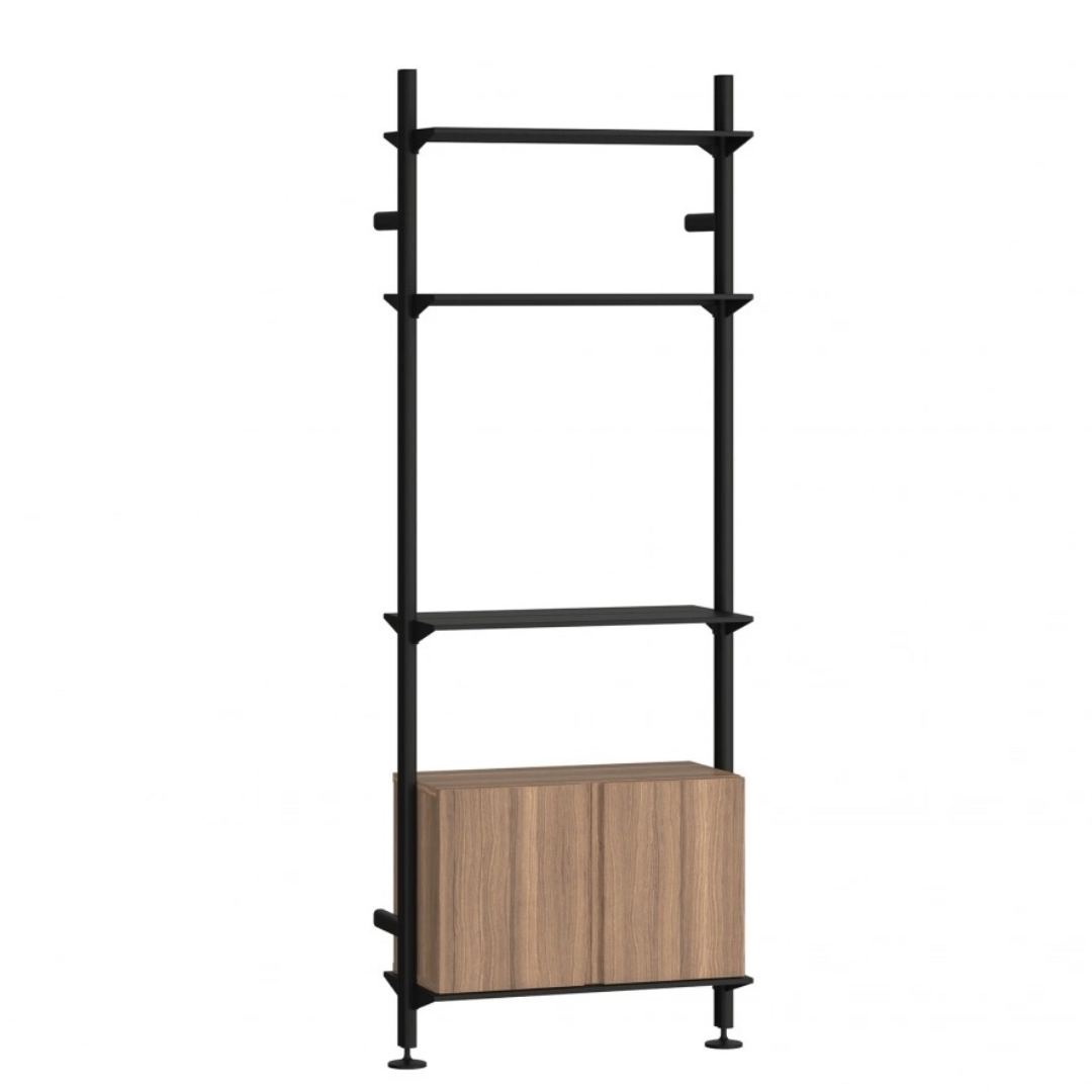 This configuration contains a total of three shelves, and a cabinet.