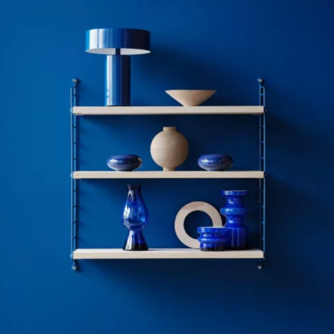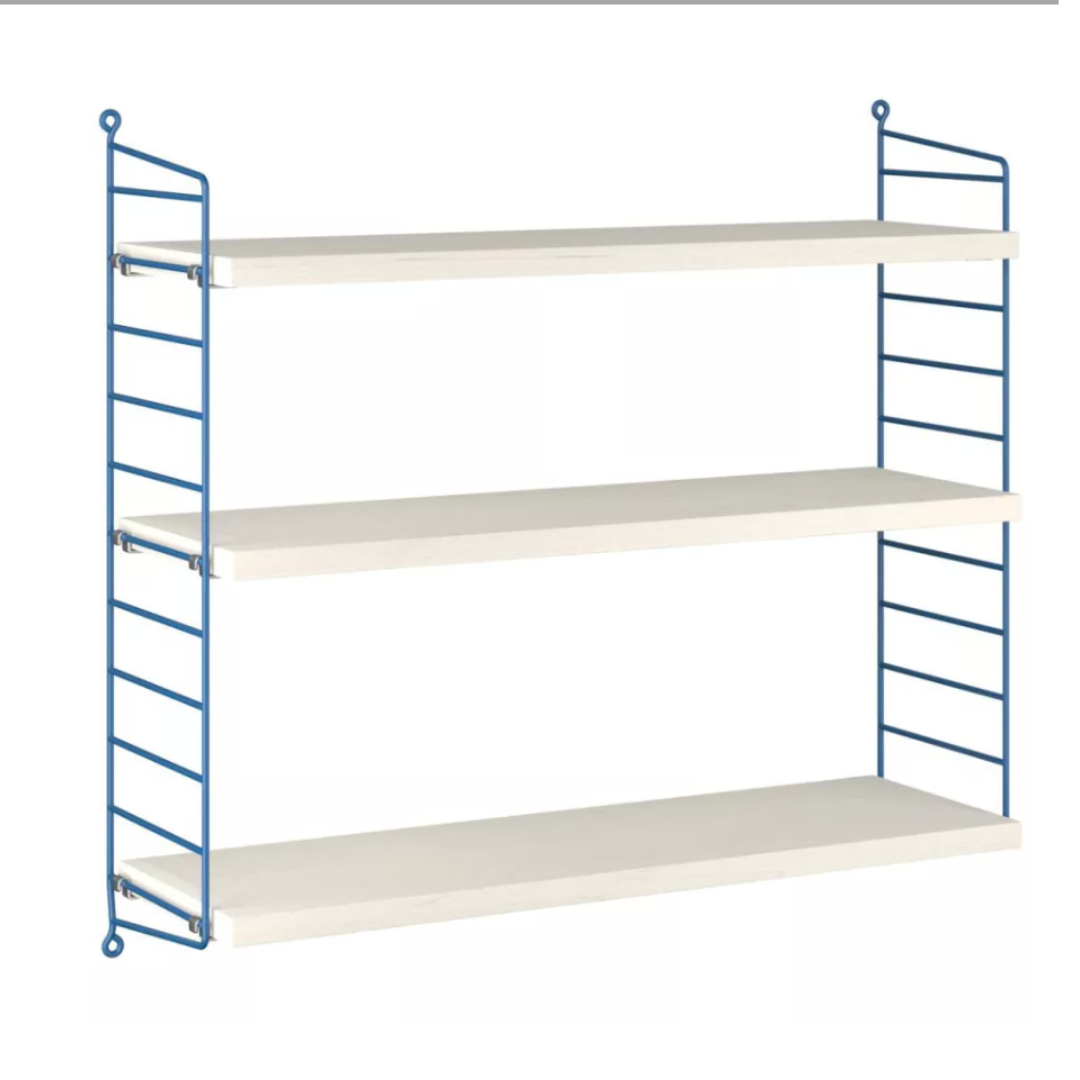 The String Pocket system contains 2 wall brackets and 3 wooden shelves. The flexible and versatile String system is ideal for the kitchen, bathroom, home office, children's room or living room.
