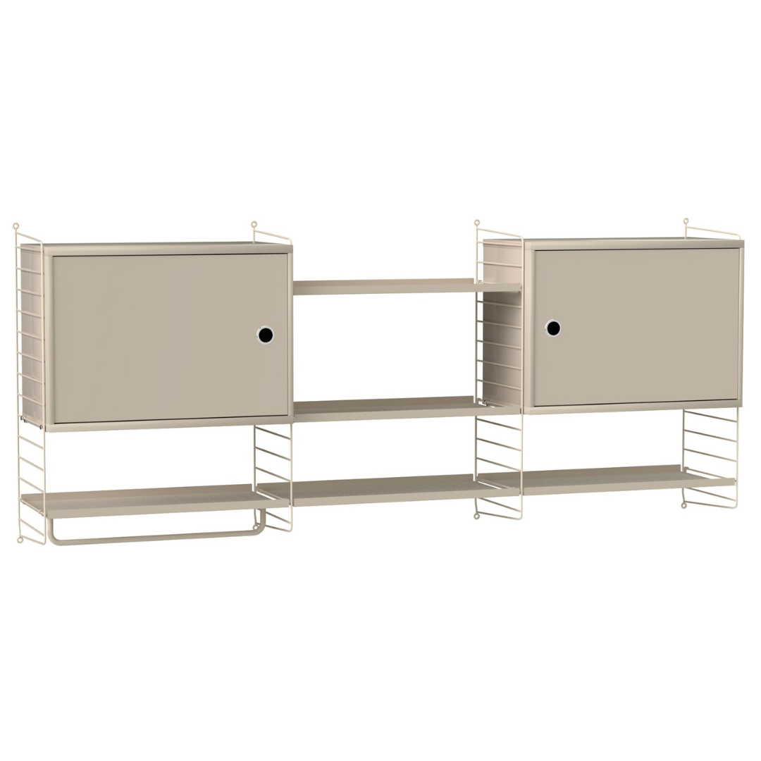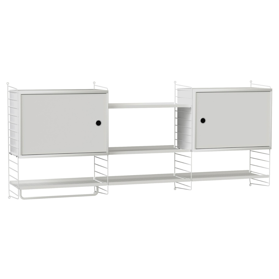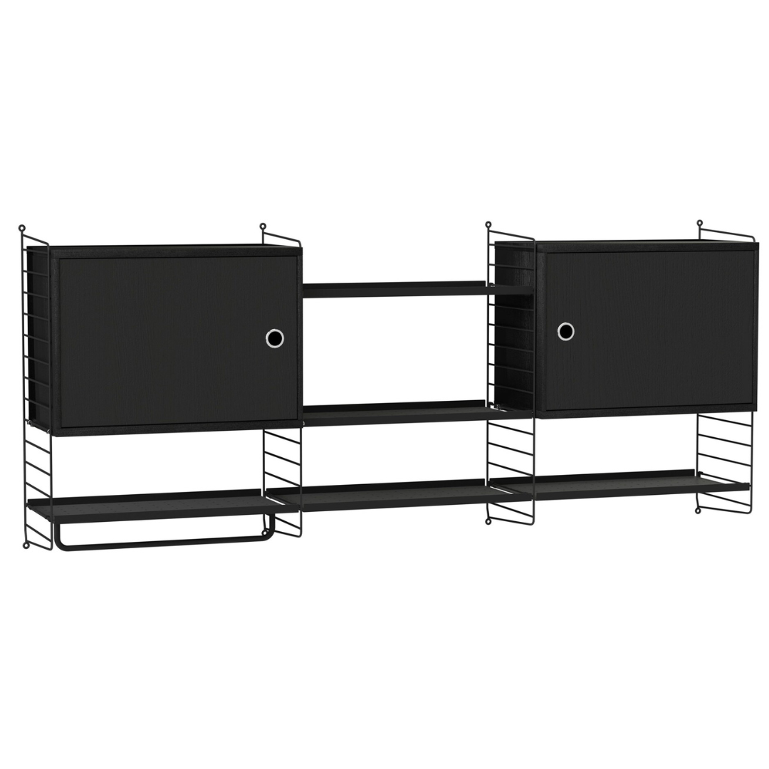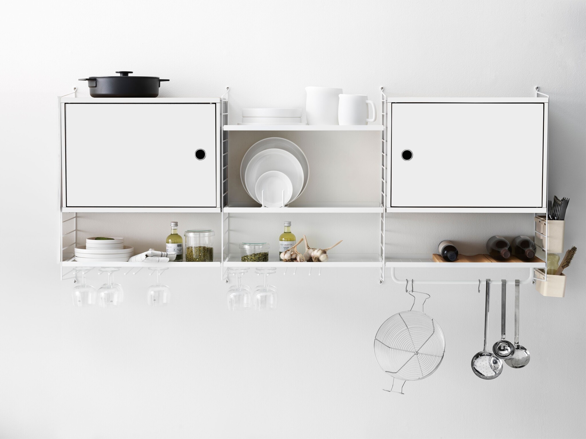 Versatile, practical and aesthetically pleasing, the String modular shelving system is designed to adapt over time, allowing you to add, replace or remove elements and adapt to your lifestyle. Perfectly used in a kitchen or dining area, the Kitchen M configuration offers plenty of storage space, with 5 metal shelves, 2 generous cupboards and a handy rail for hanging kitchen utensils.
