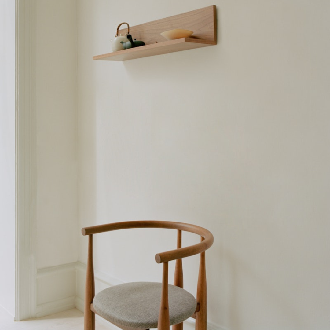 Tana is made up of wooden surfaces that meet in an effortless encounter. The horizontal surface creates an edge for your objects, while the vertical surface provides a calm, cohesive backdrop for whatever you place on the wall unit.
