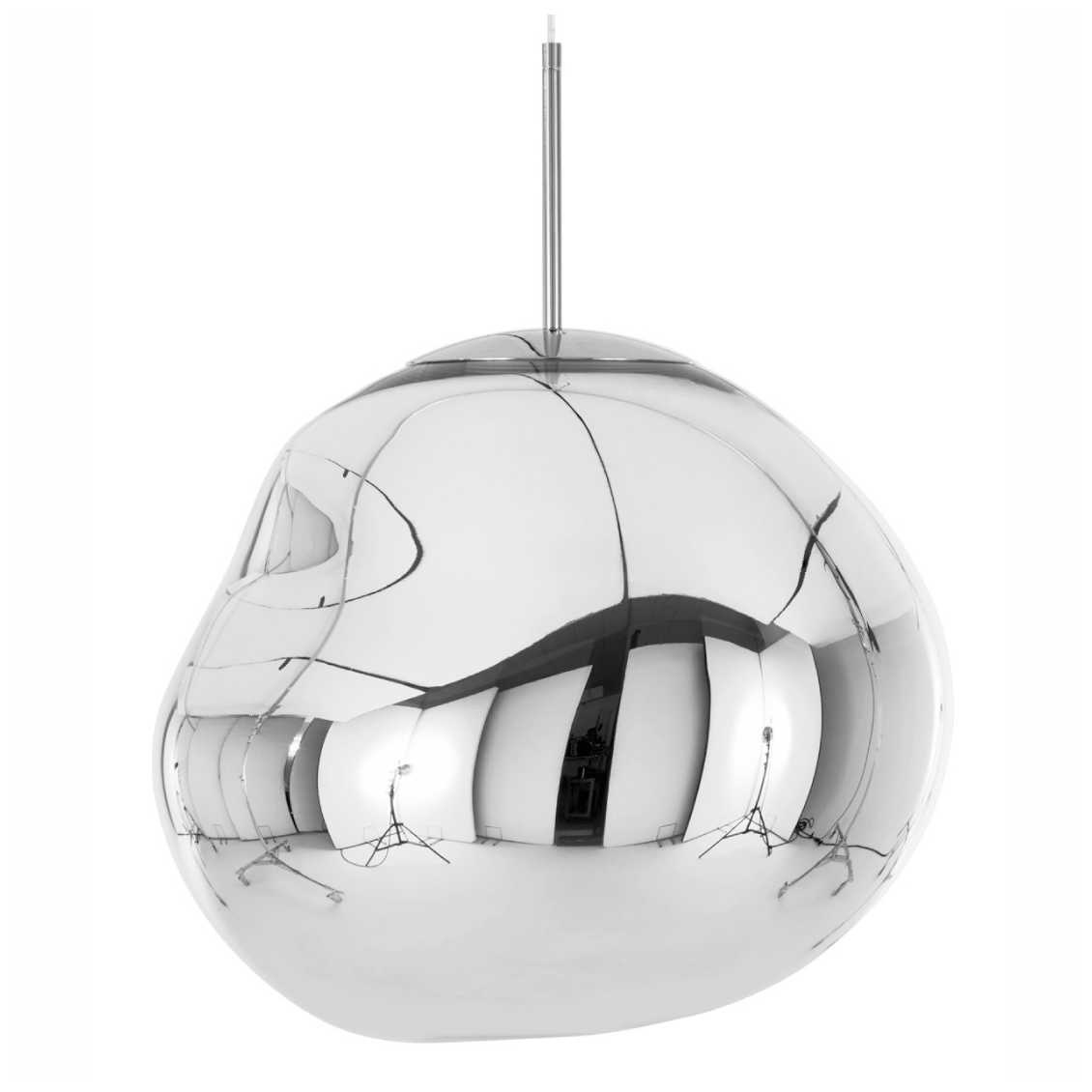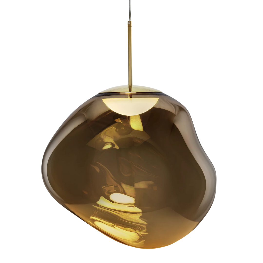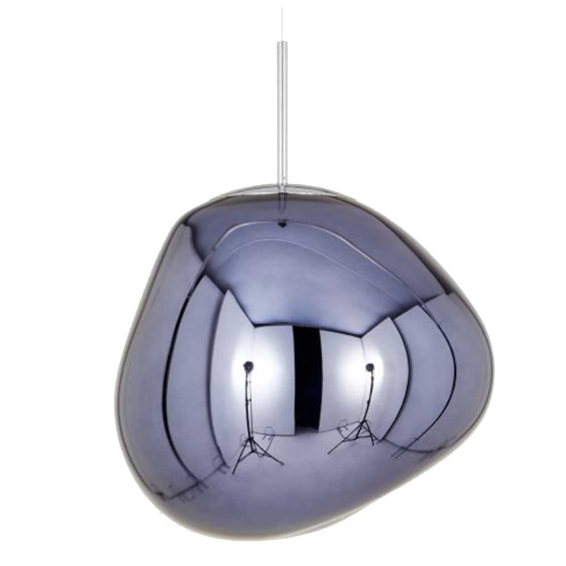 This deformed, spherical melt hanging lamp is made of polycarbonate with a layer of metal on the inside (copper, gold, chrome or smoke).
