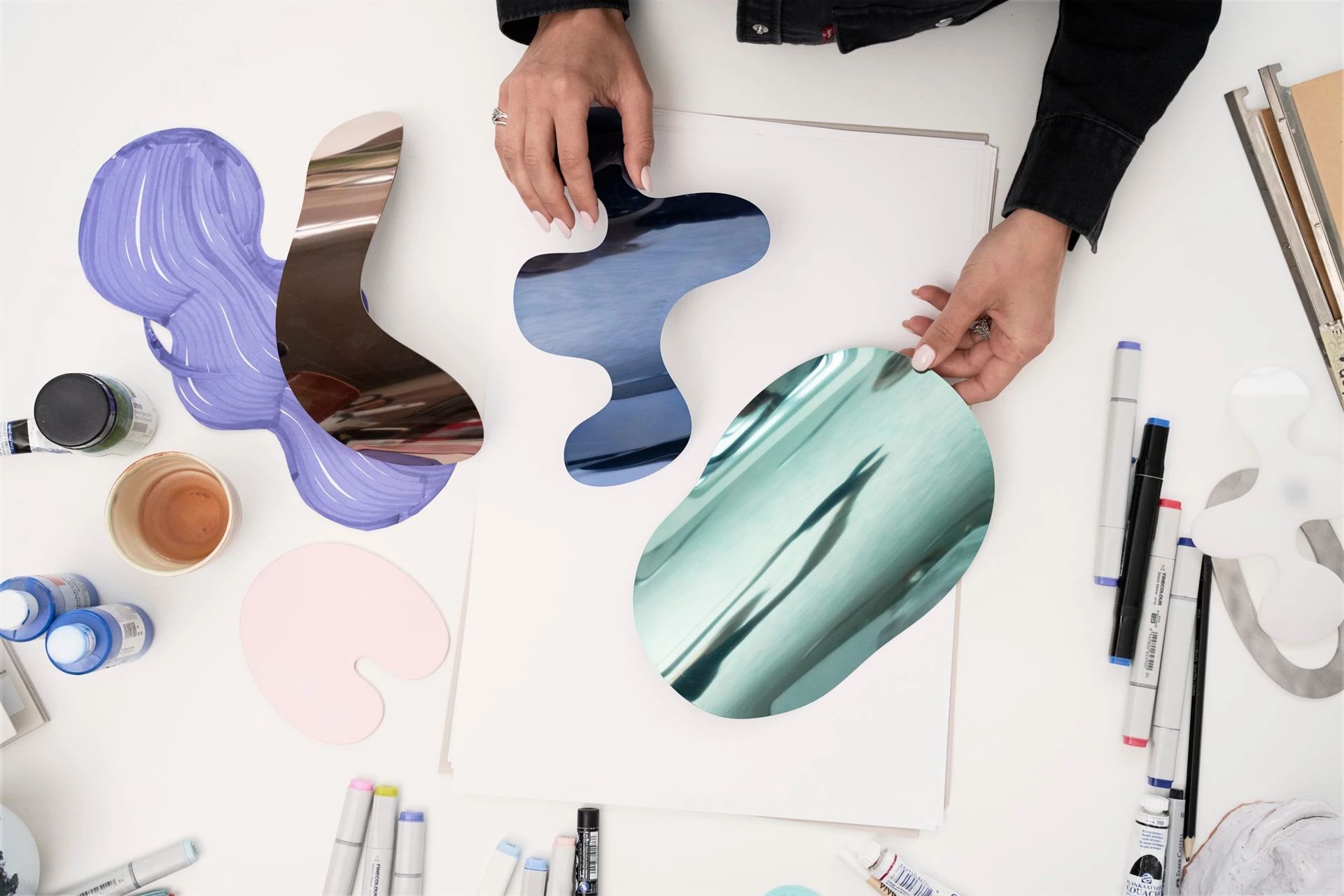 The organic and colored shapes add a refined playfulness to the stoic seriousness of a design classic. 1mm thick and fitted with magnets lined with a soft felt backing for surface protection, the colorful shapes add an extra dimensional layer to the pendulum bin while the steel surface provides an illusory dimension of depth through the mirrored environment.