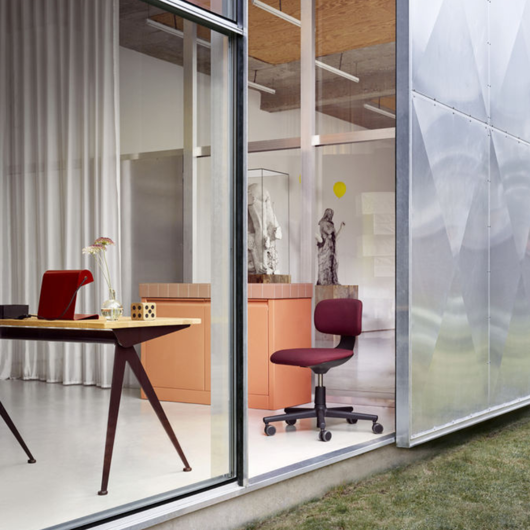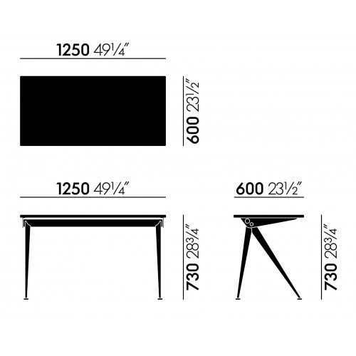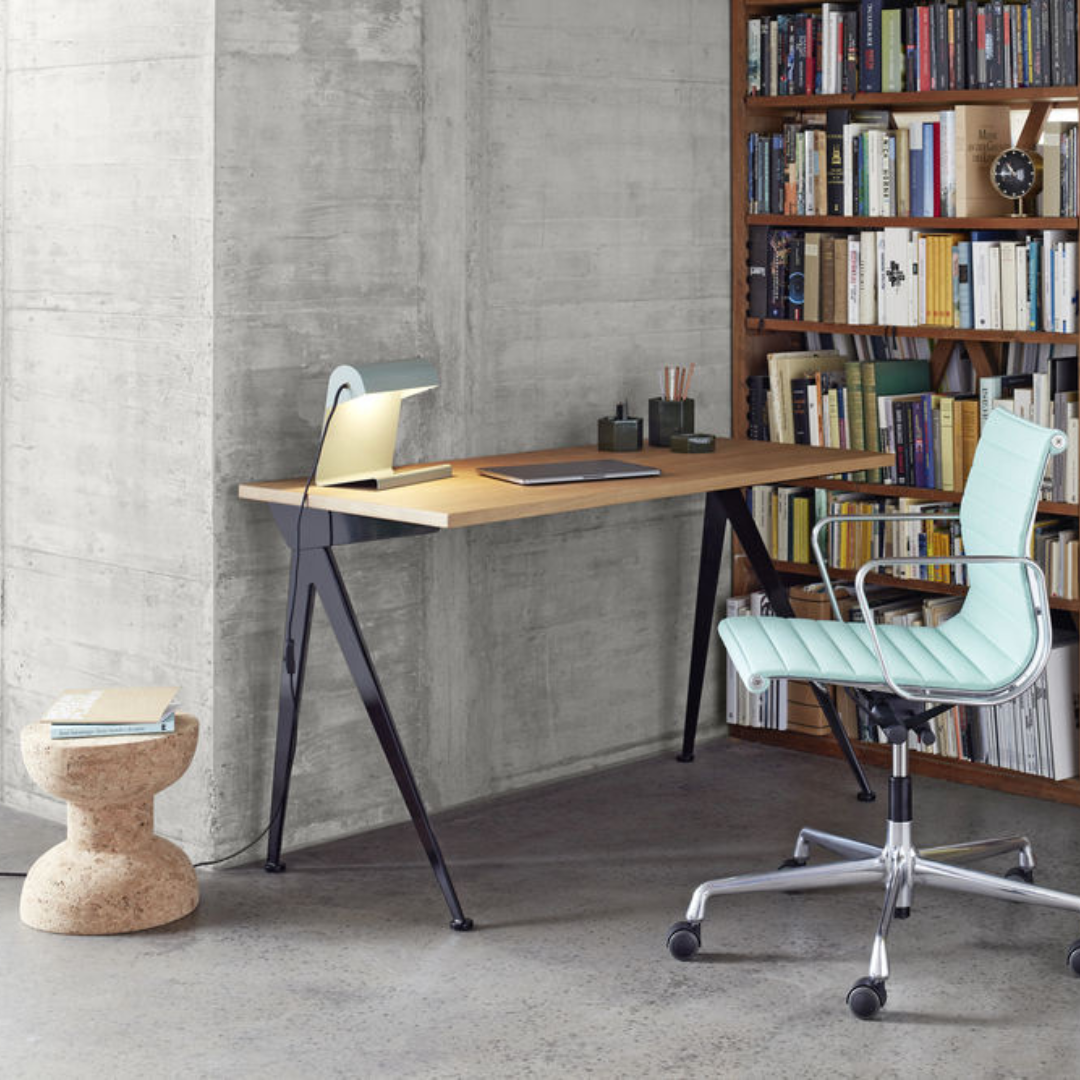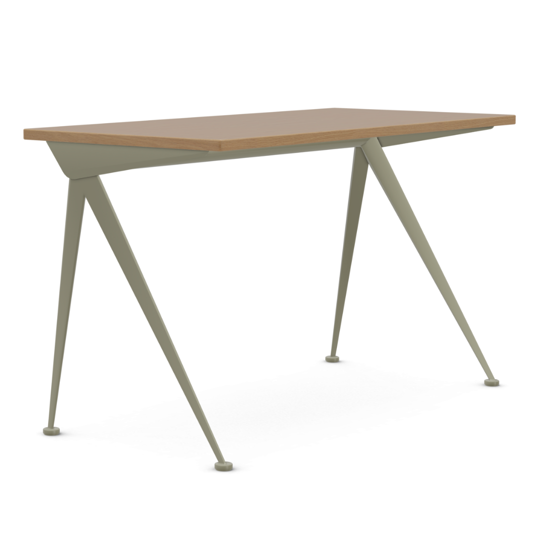 Jean Prouvé designed different versions of the Compas Direction desk in the 1950s, using the construction principle of his contemporary style. Common feature: the metal base whose tapered shape in reverse V evokes a school compass.