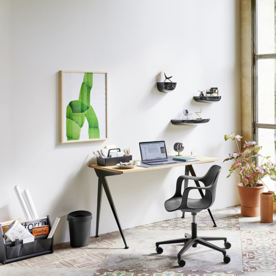 The oiled solid wood top (oak, smoked oak or American walnut) gives it a luxurious and a nice comfortable touch. Due to its compact dimensions, it is a perfectly contemporary desk, where the computer replaces the stacks of old paper.