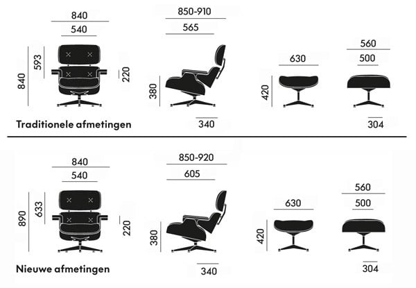 Eames Lounge Chair is available in two sizes: The original, classic dimensions and the new, larger dimensions.