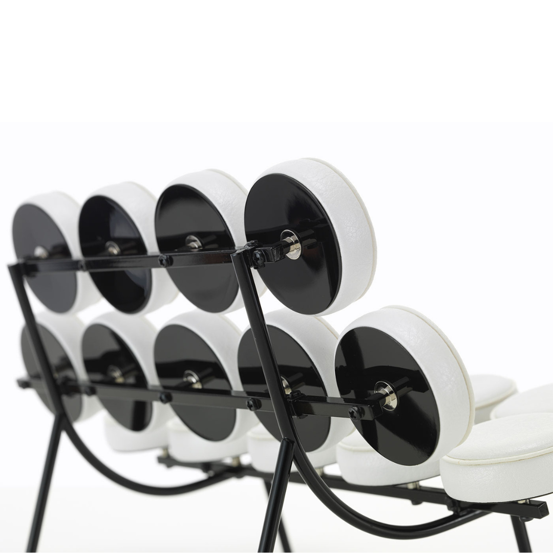 Nelson's 'Marshmallow' sofa should be considered one of the earliest 'Pop Art' furniture designs: the transformation of a traditional sofa into a three-dimensional structure made of soft, colored cushions. The seat and backrest are supported by a steel construction and the furniture has the shape of an axially symmetrical unfolded waffle. Painted steel tubes, aluminum, with cushions.
