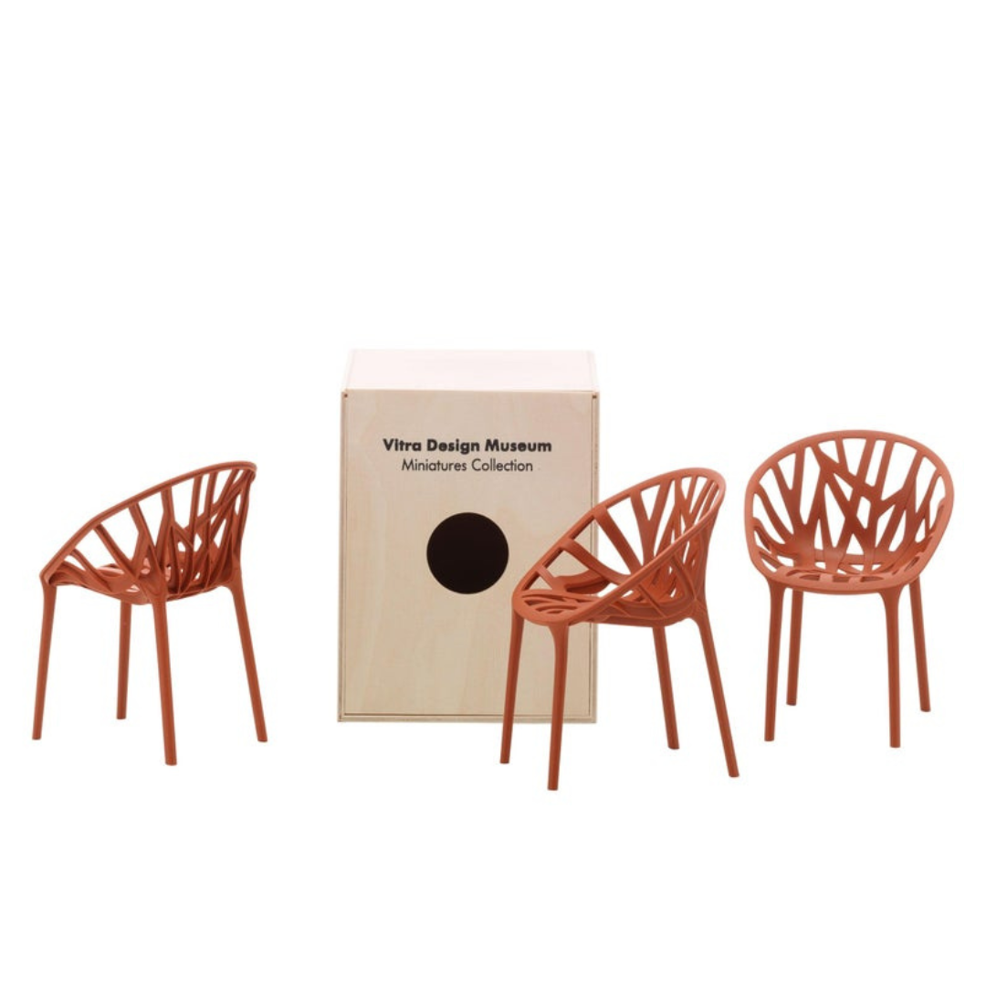 Material: Miniature chair made of brick red plastic. Comes in a beautiful gift box from the Vitra Design Museum.