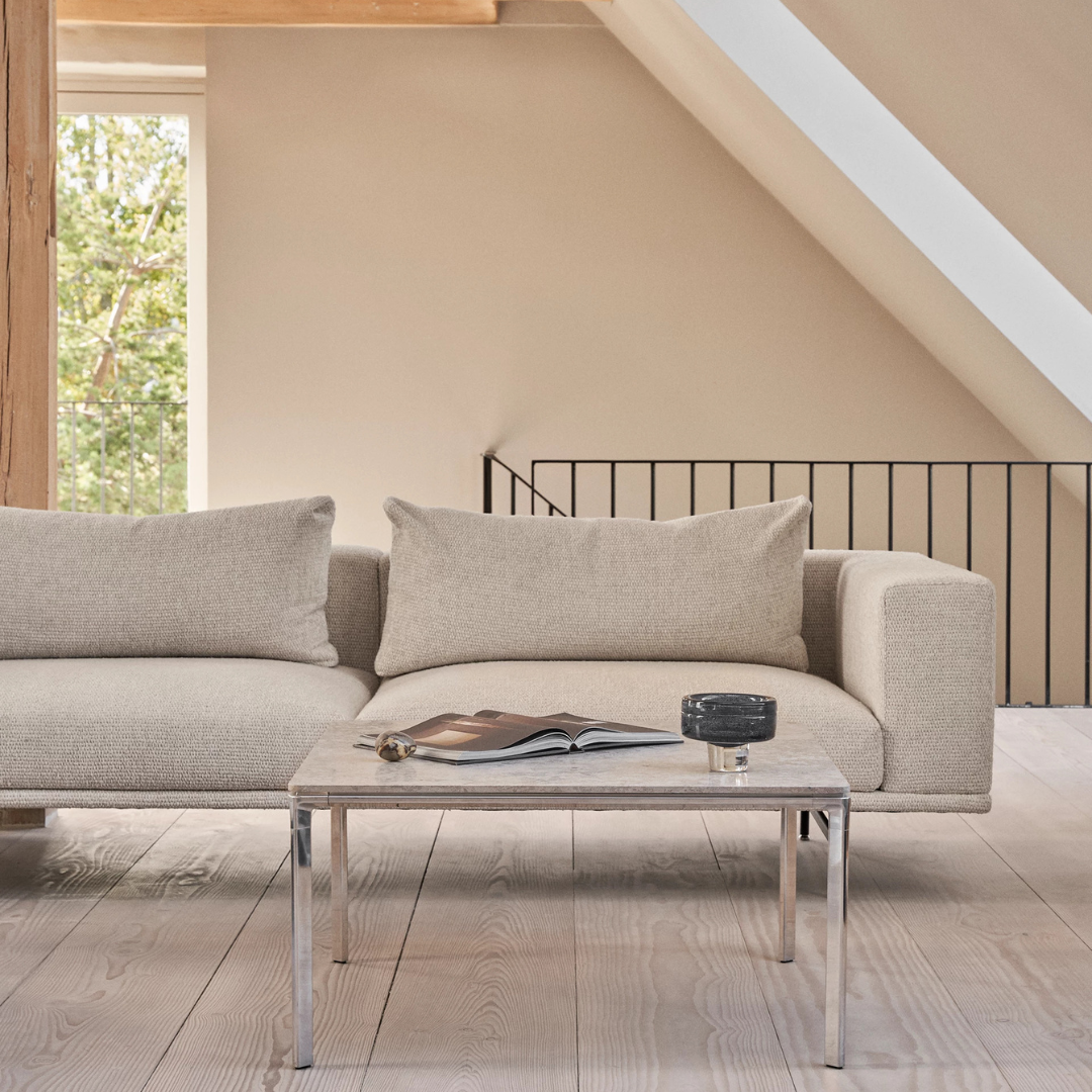 De salontafel heeft een vierpootsframe van gepolijst aluminium en een zwevend marmeren tafelblad dat past bij hetzelfde duurzame vakmanschap, tijdloze ontwerp en aandacht voor detail dat terug te vinden is in de geschiedenis van Vipp op het gebied van gegoten metaal sinds 1939.