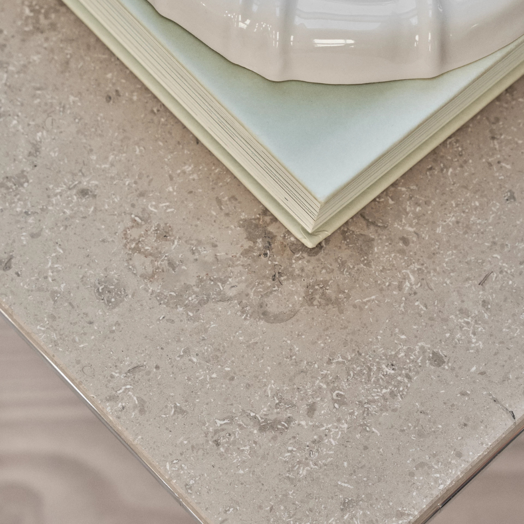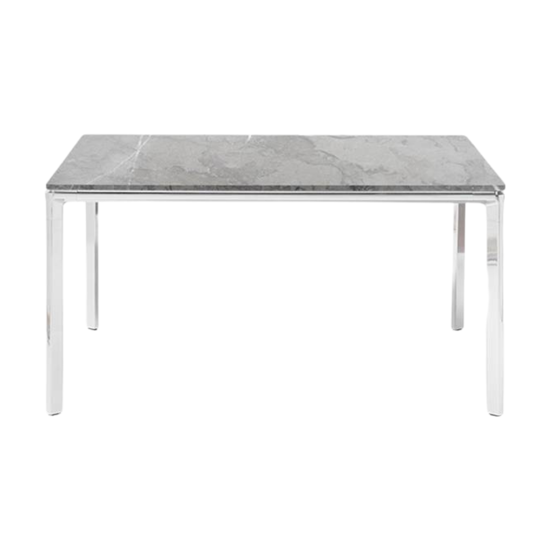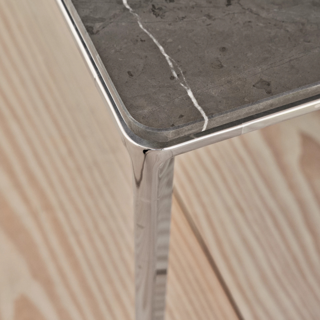 De Vipp salontafel is een veelzijdige tafel voor in de woon- of slaapkamer. Een ontwerp met vier poten in gepolijst aluminium die de tafel een luchtige uitstraling geven, en met een luxe en tijdloos grijs marmeren blad.