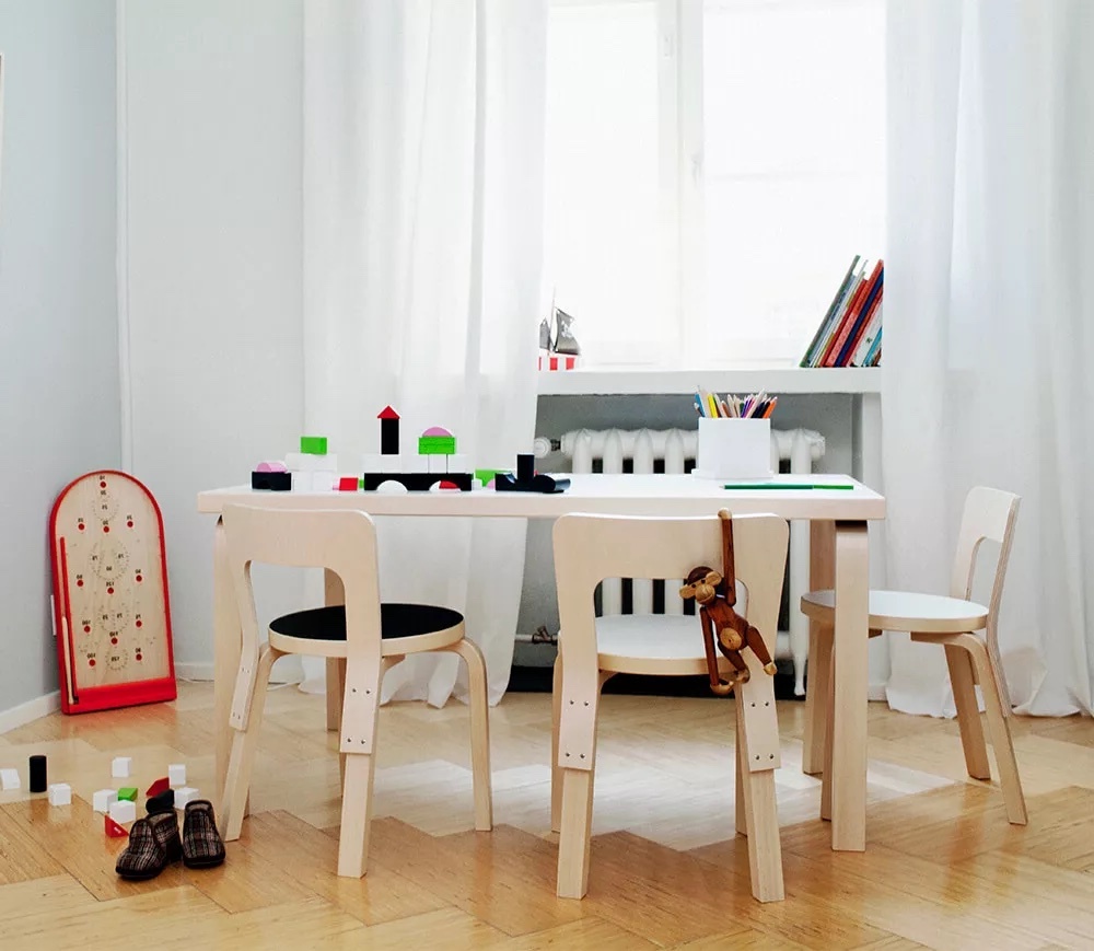 De Artek 80A tafel van Alvar Aalto uit 1933 is van een eenvoudige, elementaire structuur en ideaal voor in de kinderkamer, met een hoogte van 60 cm.