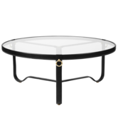Geplaatst op drie licht gebogen metalen poten, deze komen samen in het hart van de tafel, de ronde glazen bovenkant is afgewerkt met een handgemaakte lederen rand en versierd met drie vergulde koperen ringen. Het tijdloze ontwerp van de Adnet Coffee Table belichaamt moderne materialen en uitmuntend vakmanschap en voegt een onderscheidende waarde toe aan elke woning of bedrijfsmatige ruimte.