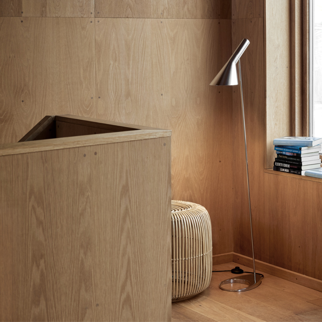Deze vloerlamp van Arne Jacobsen is een "down-lichter" het licht wordt dus hoofdzakelijk naar beneden toe verspreidt .