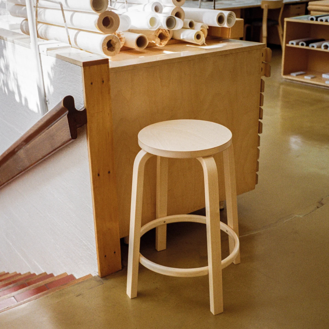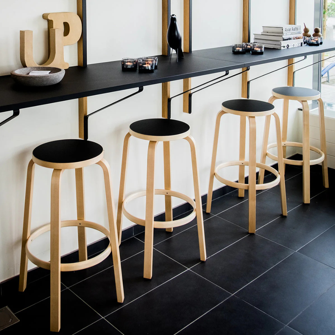 De Bar Stool 64 is een tijdloze design klassieker van Alvar Aalto, perfect voor keukens, cafés, bars en aanrechtbladen. Bewonderd door Steve Jobs, is het in verschillende Apple Stores gebruikt. Symmetrisch en niet-directioneel, de Bar Stool 64 staat altijd in de juiste richting.