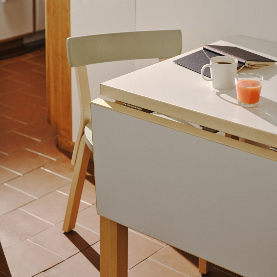 De opvouwbare tafel DL81C van Artek, ontworpen door Alvar Aalto in 1933, is een compacte en veelzijdige houten eettafel met een opklapbaar verlengstuk dat moeiteloos extra ruimte rond de tafel biedt wanneer u deze nodig heeft.