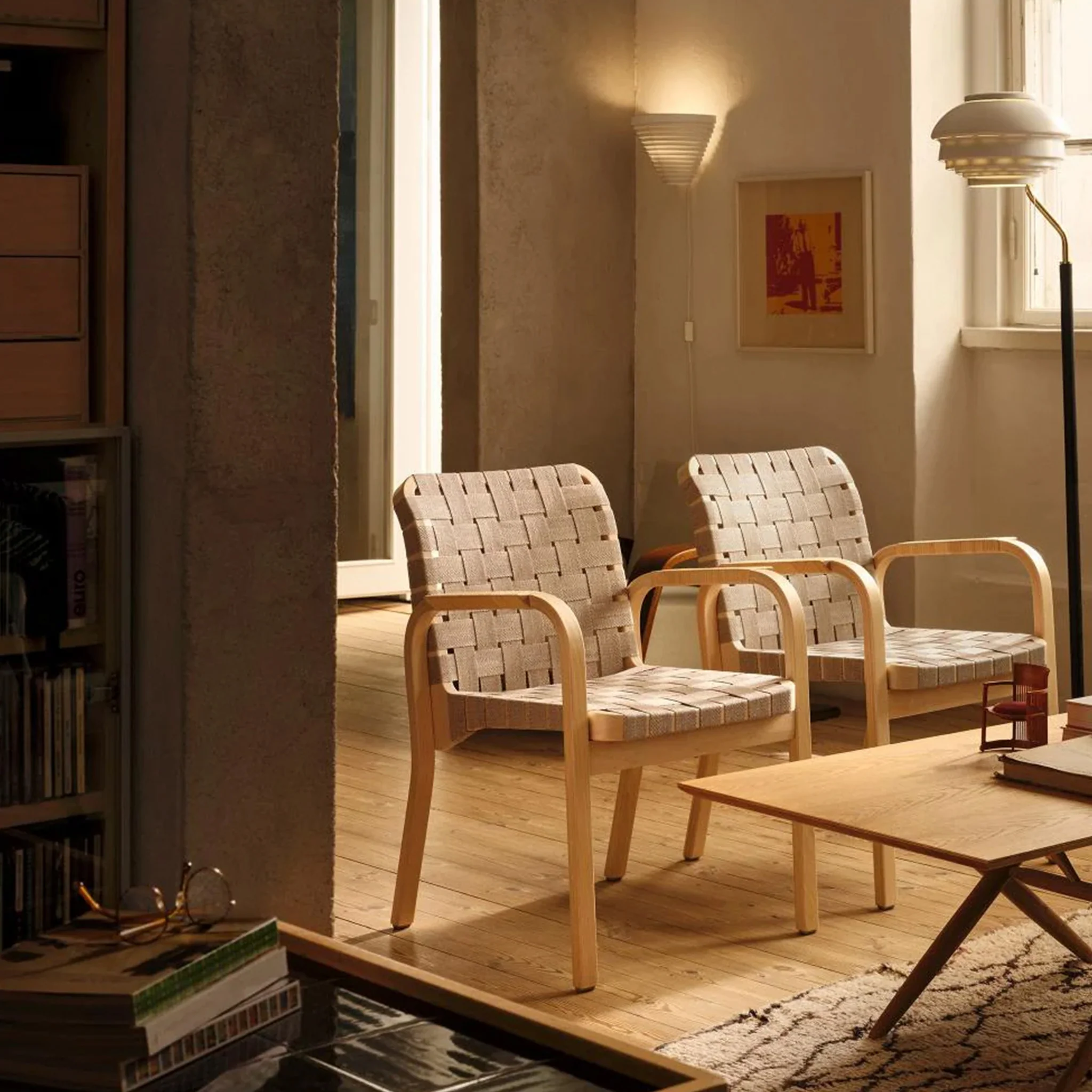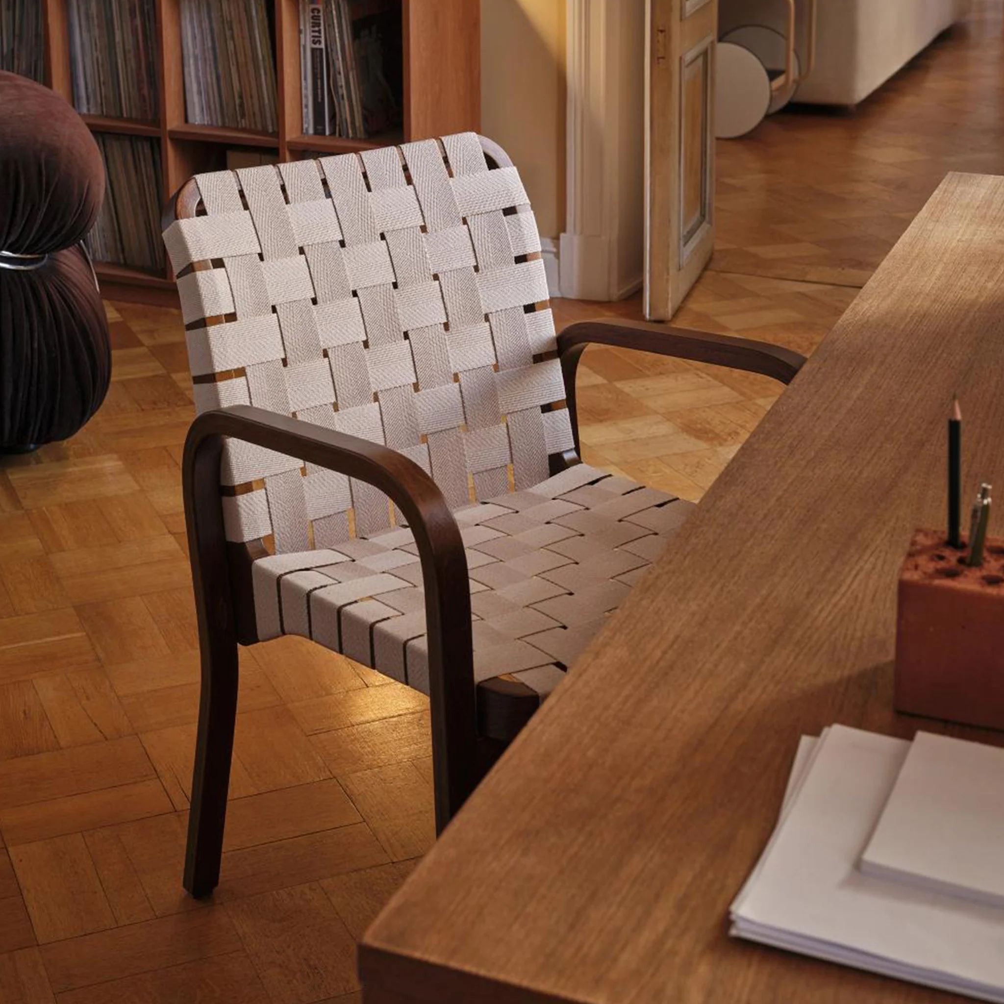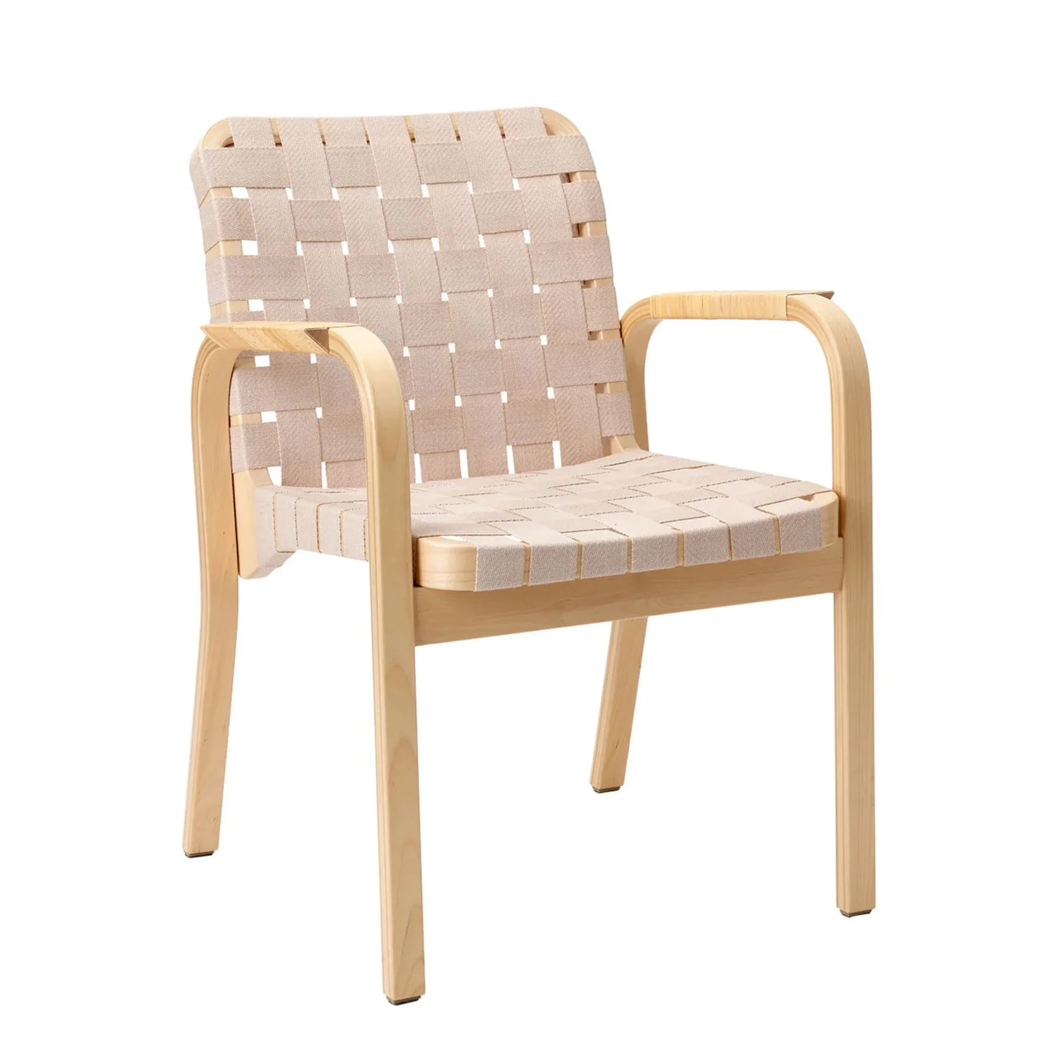 Het lichtgewicht frame van de verfijnde Armchair 45, ontworpen door Alvar Aalto in 1947, deze heeft mooie details in natuurlijke materialen.