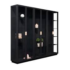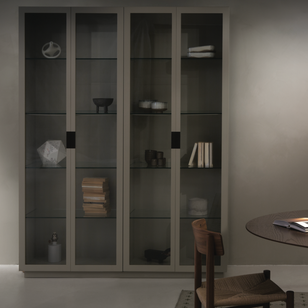 Een opbergserie in gelakt MDF, bekleed met glazen vouwdeuren voorzien van lederen handgrepen. Met vier glazen leg planken. lederen handgrepen komen in naturel, cognac, donker bruin en zwart.