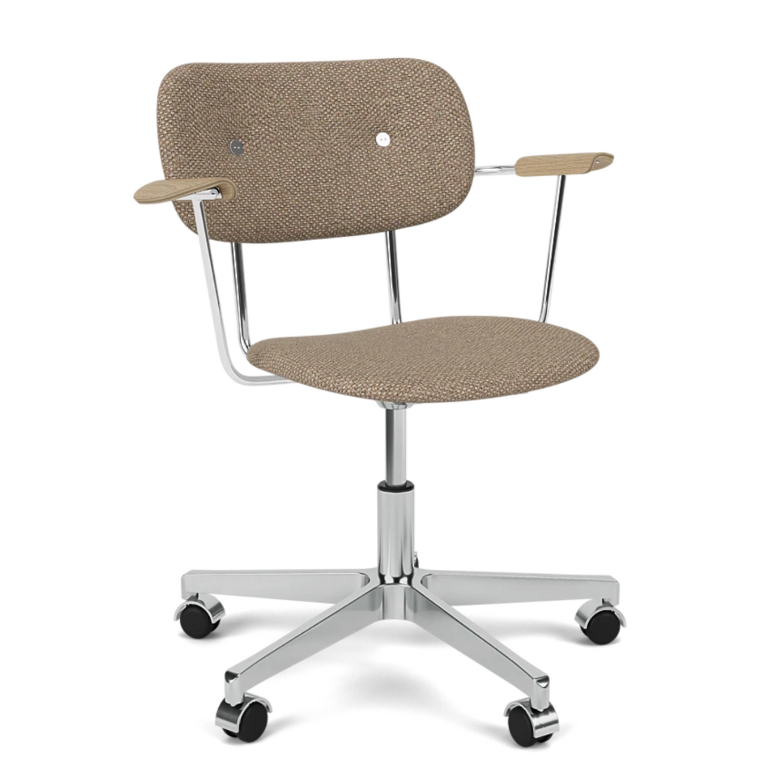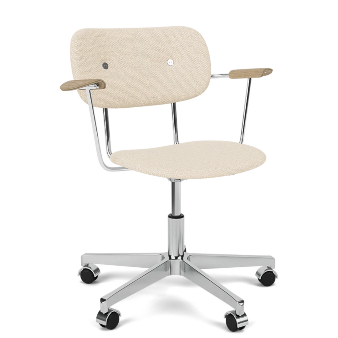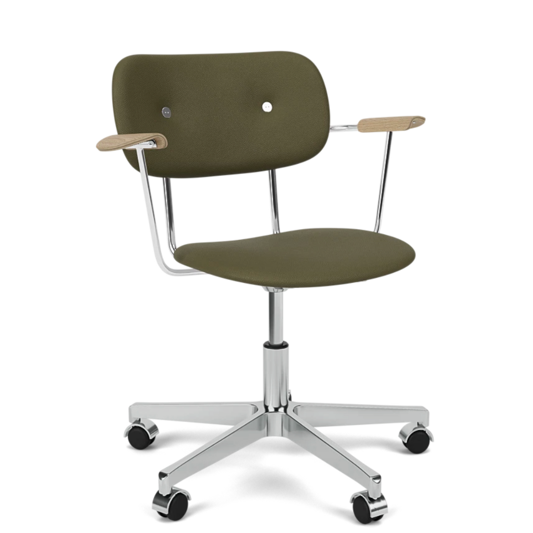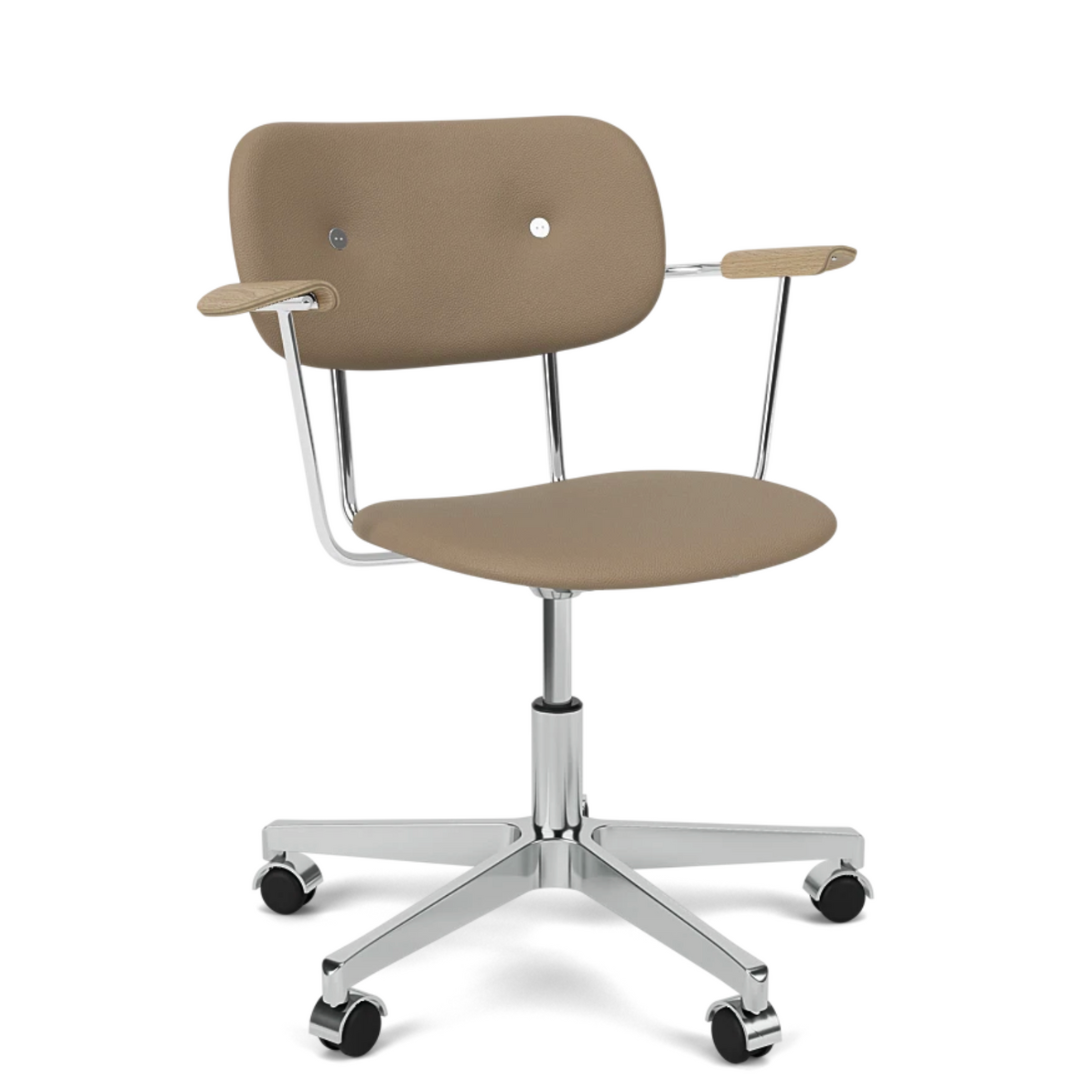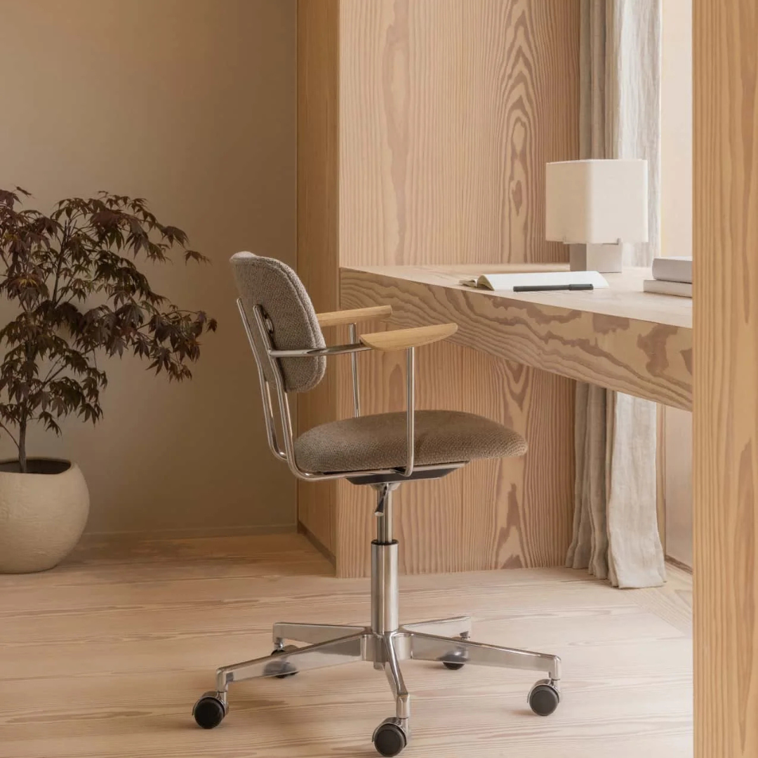 De Co Task Fauteuil integreert naadloos zitcomfort en flexibele functie in zijn minimalistische uitstraling. Ontworpen voor een breed scala aan werkomstandigheden en geplaatst op een vijfsterren verchroomde draaibasis met zwenkwielen, zorgt een in hoogte verstelbare functie voor aanpasbaarheid aan werkruimtes en gebruikers-voorkeuren, wat ergonomisch comfort bevordert voor gebruikers van verschillende lengtes.