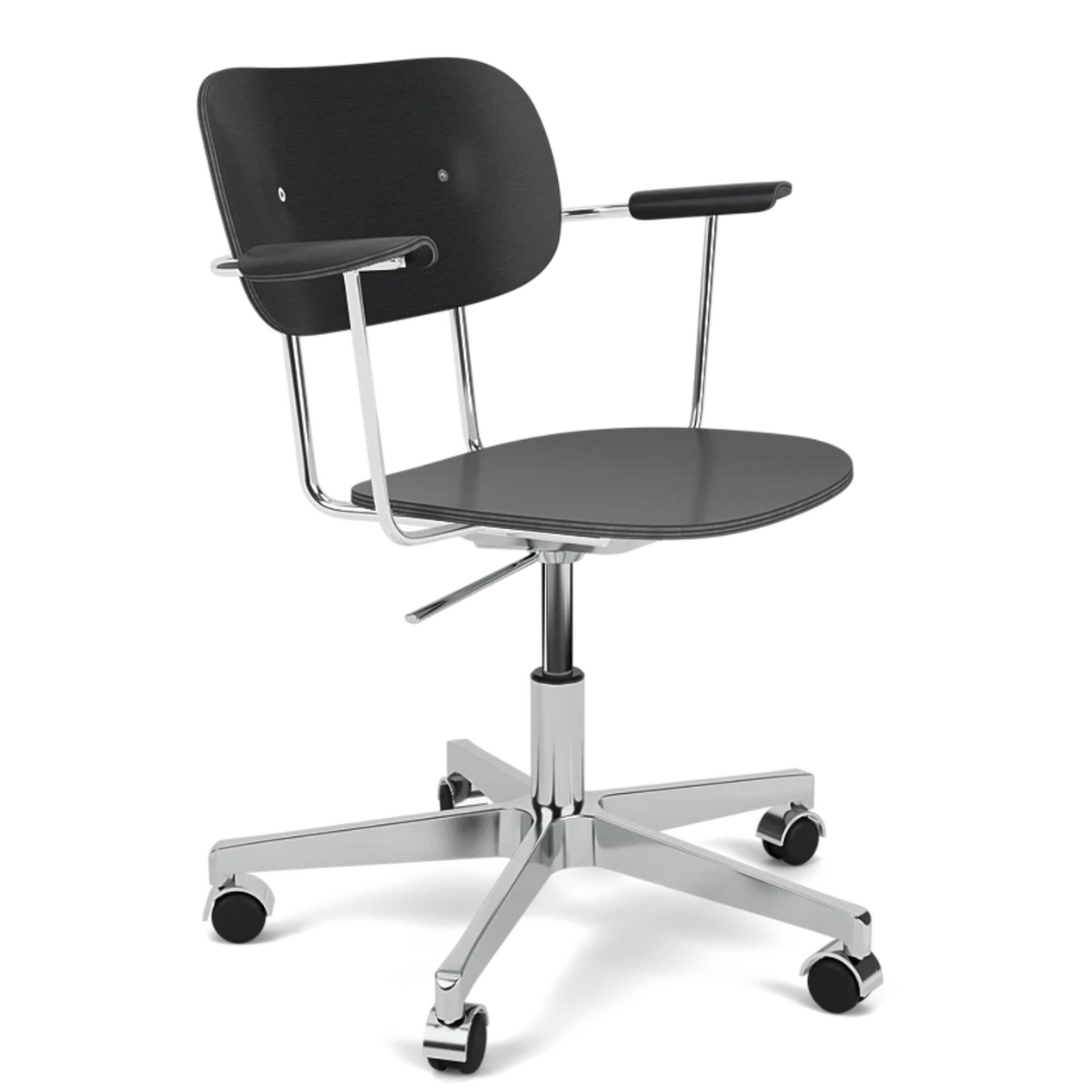De Co Task Fauteuil integreert naadloos zitcomfort en flexibele functie in zijn minimalistische uitstraling. Ontworpen voor een breed scala aan werkomstandigheden en geplaatst op een vijfsterren verchroomde draaibasis met zwenkwielen, zorgt een in hoogte verstelbare functie voor aanpasbaarheid aan werkruimtes en gebruikersvoorkeuren, wat ergonomisch comfort bevordert voor gebruikers van verschillende lengtes.