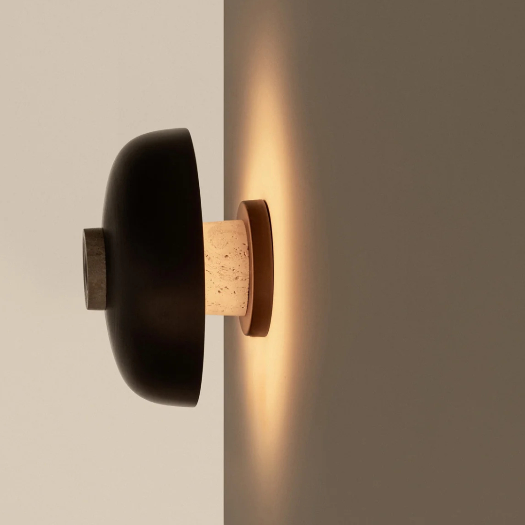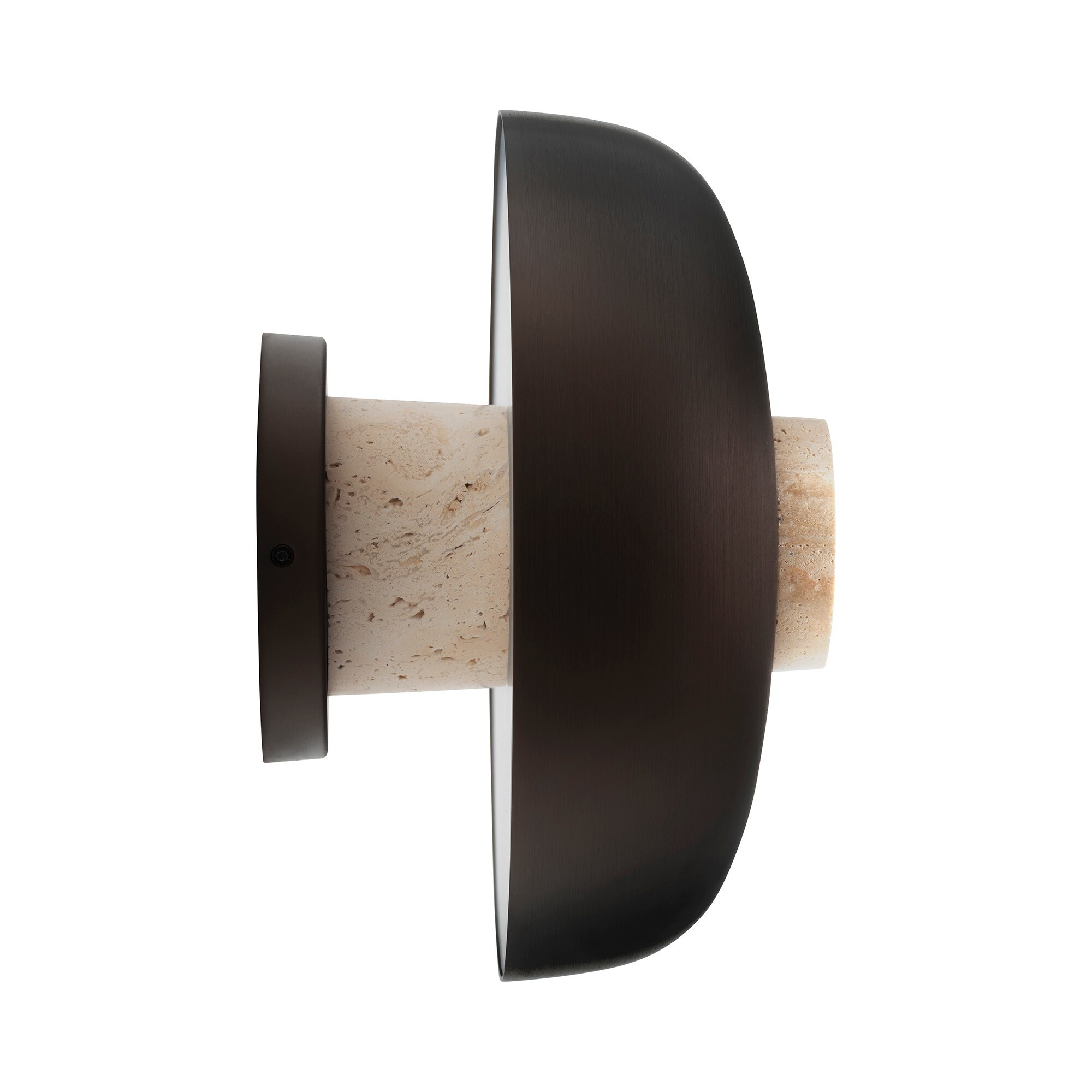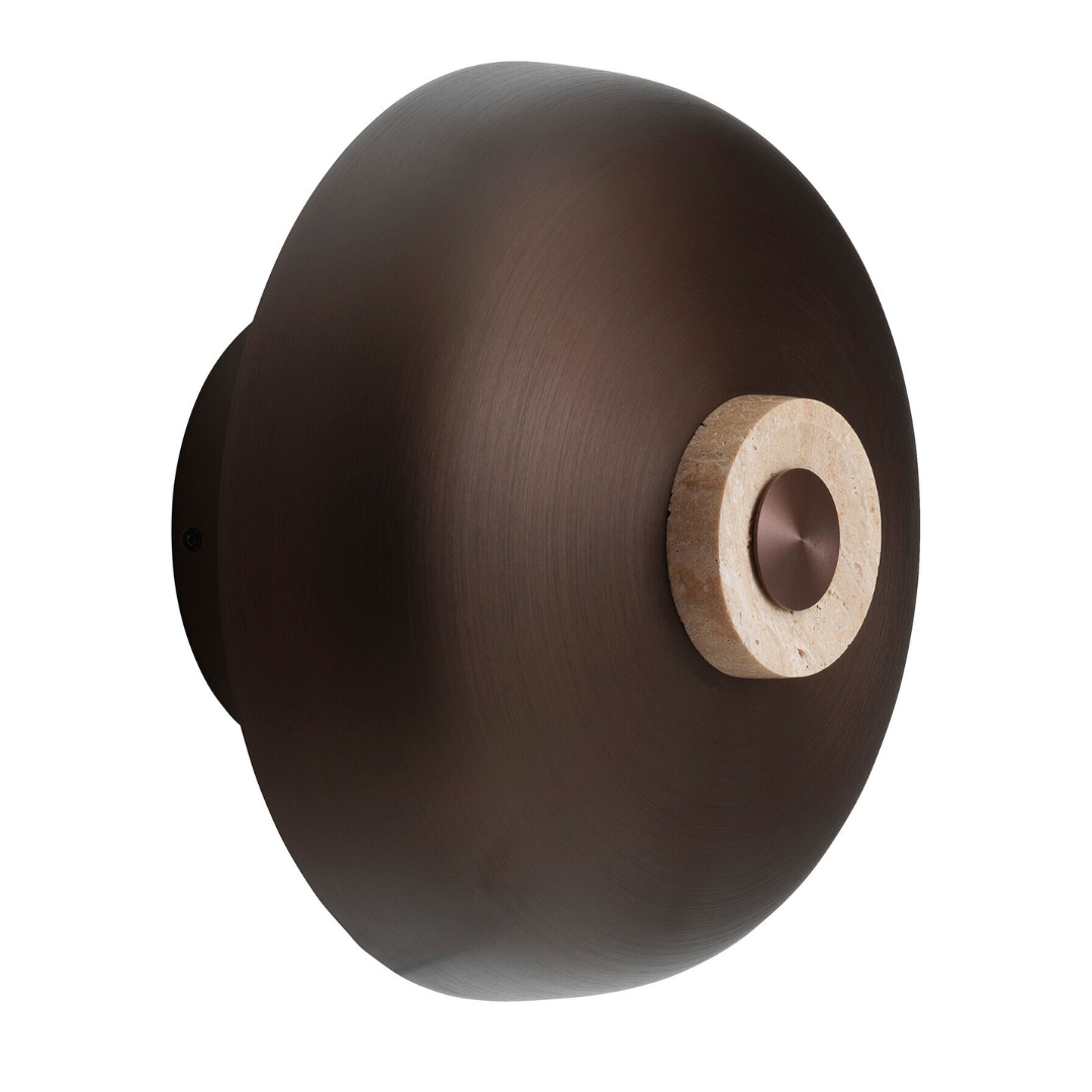 De wandlamp is gemaakt van onbehandeld travertijn steen, gevormd in een geometrische vorm met natuurlijke onvolkomenheden die de schoonheid van het natuursteen laten zien. Daarentegen is de kap gemaakt van geanodiseerd bronskleurig aluminium met een gladde afwerking voor een gepolijste touch.