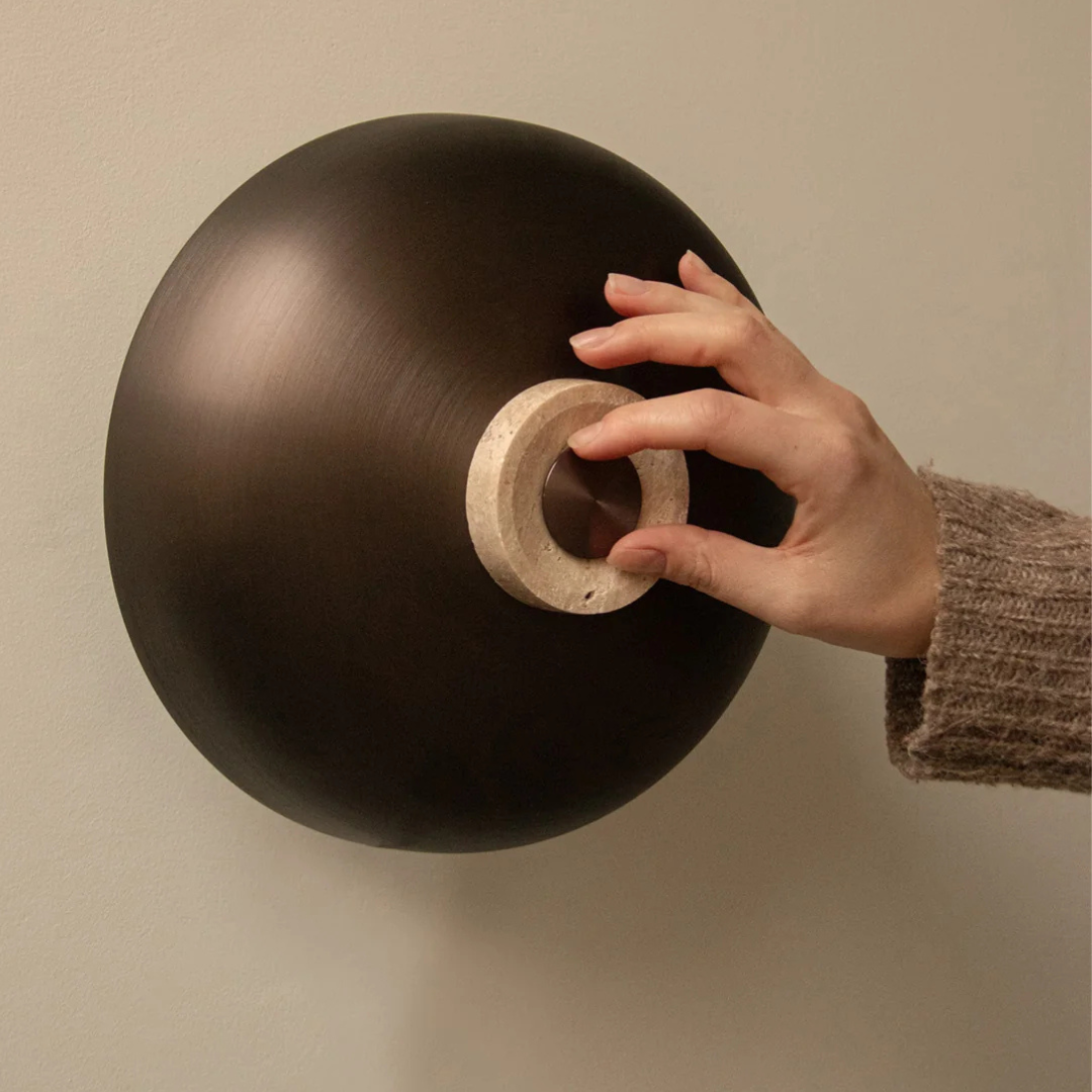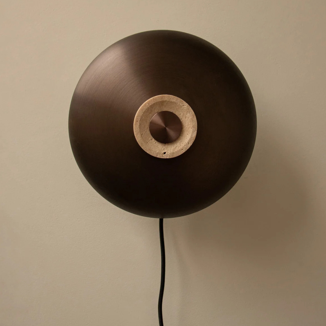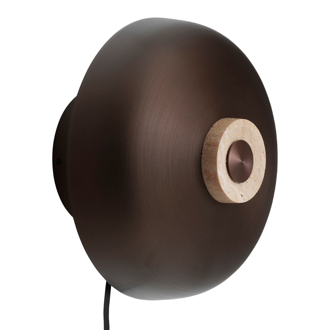 De wandlamp is gemaakt van onbehandeld travertijn steen, gevormd in een geometrische vorm met natuurlijke onvolkomenheden die de schoonheid van het natuursteen laten zien. Daarentegen is de kap gemaakt van geanodiseerd bronskleurig aluminium met een gladde afwerking voor een gepolijste touch.