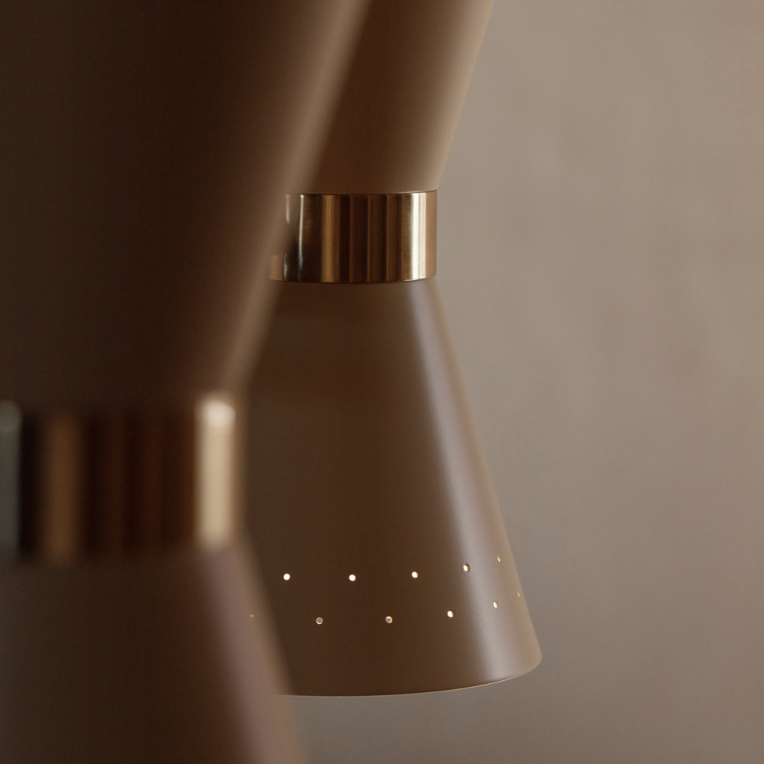 Deze tijdloos moderne hanglamp bestaat uit drie conische aluminium kappen met kleine gaatjes in de bodem. Het licht schijnt zowel naar boven als naar beneden, maar ook door kleine, geperforeerde gaatjes, waardoor het licht prachtig wordt gefilterd.