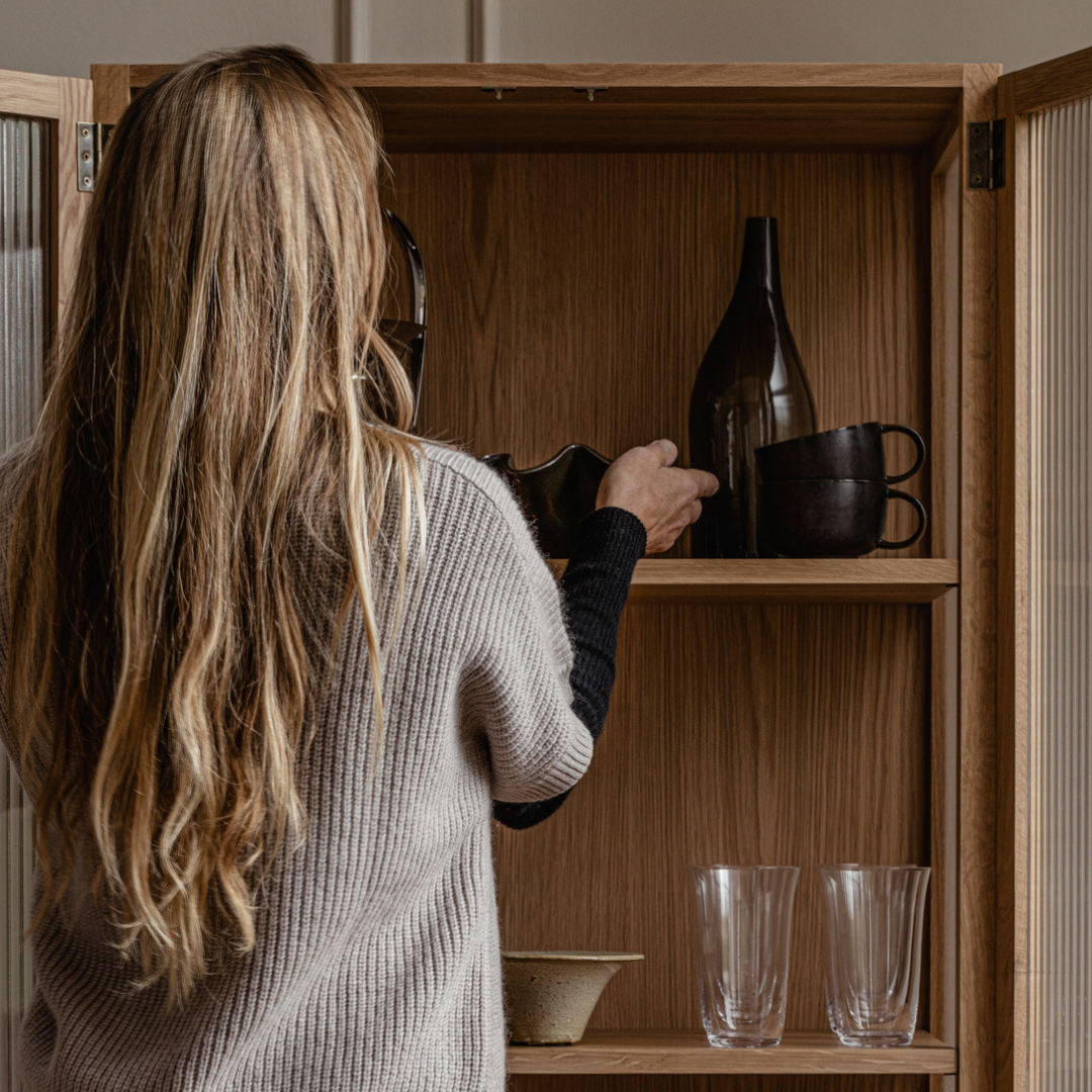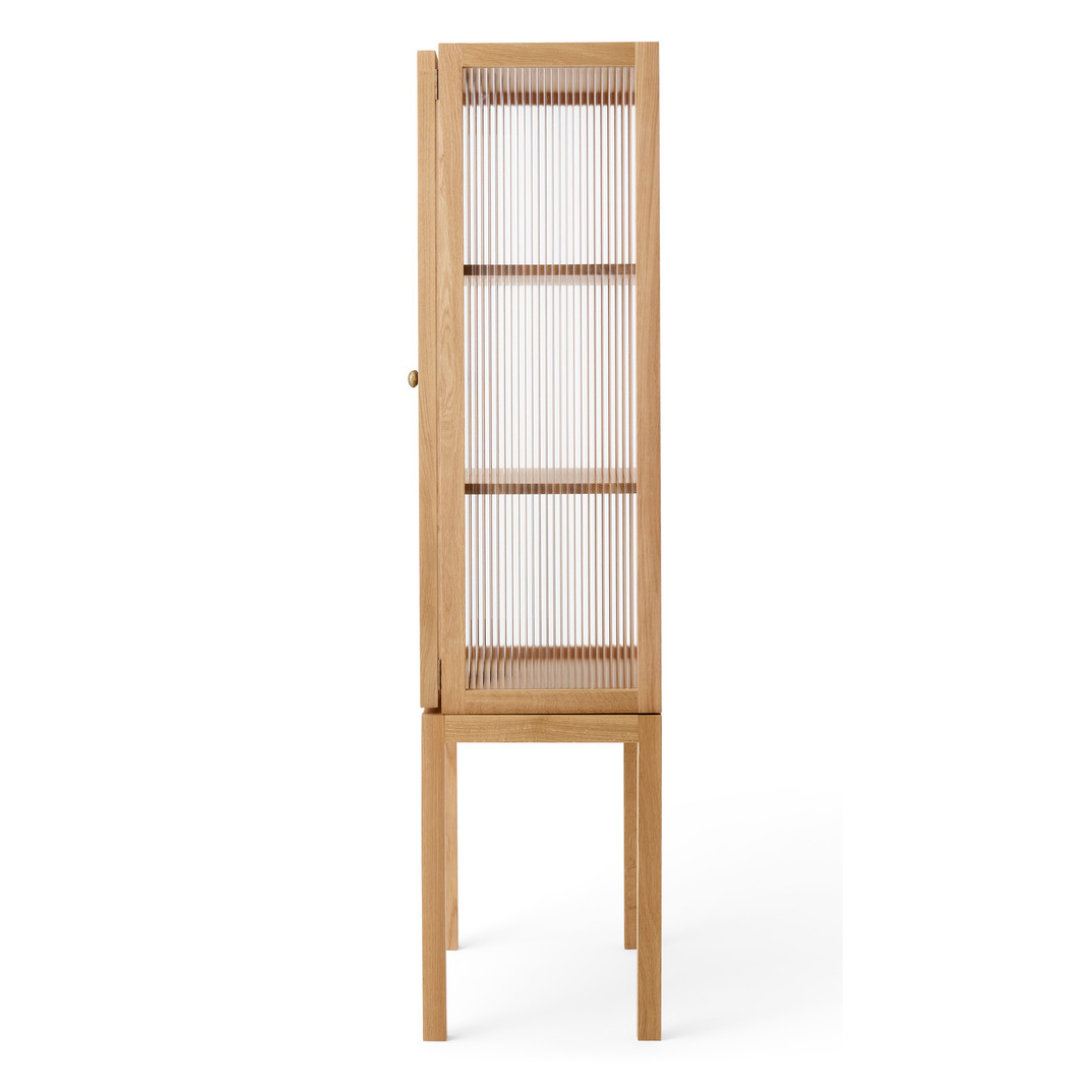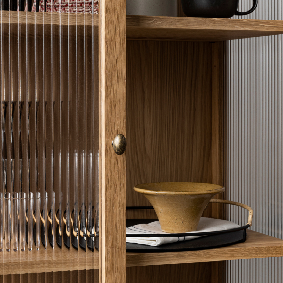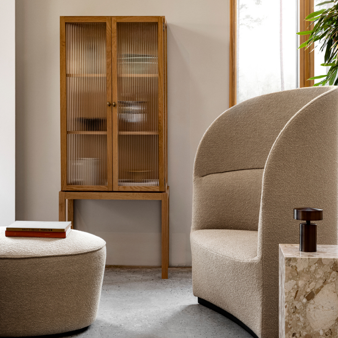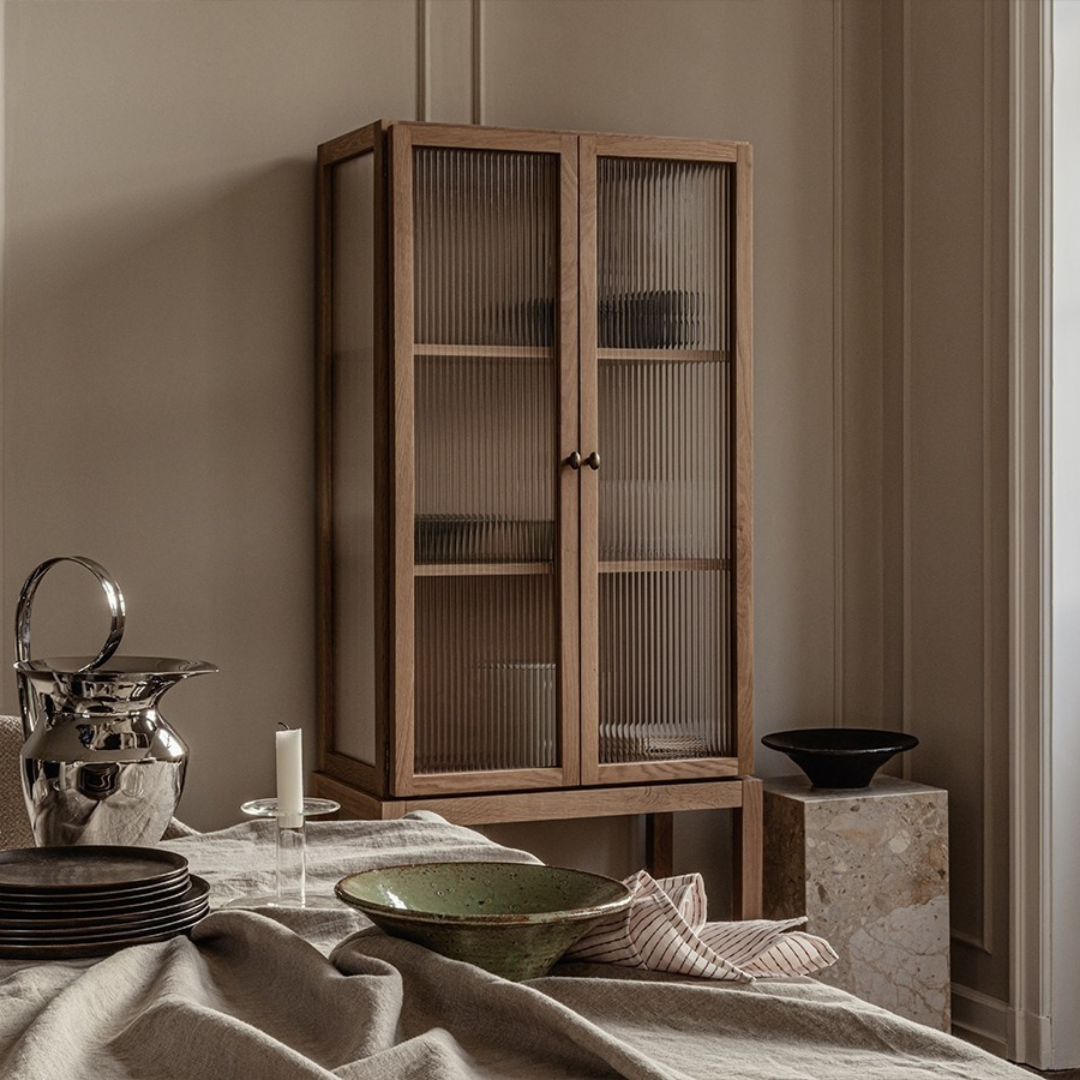 Met mat glazen deuren die de inhoud sierlijk vervagen, biedt de Audo Curiosity-kast een eenvoudige maar stijlvolle bergplaats voor allerlei soorten objecten - van keuken- en serviesgoed tot benodigdheden voor thuis of op kantoor.