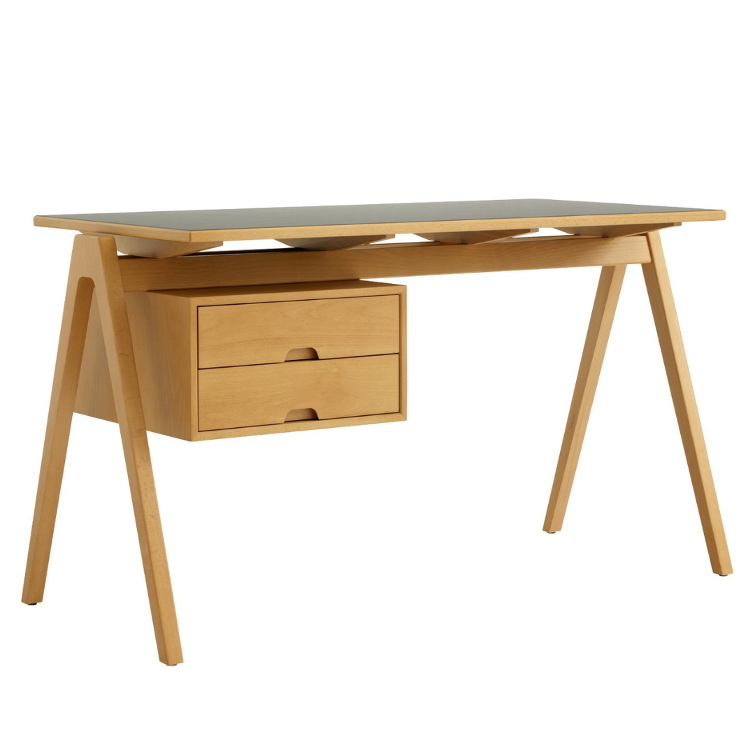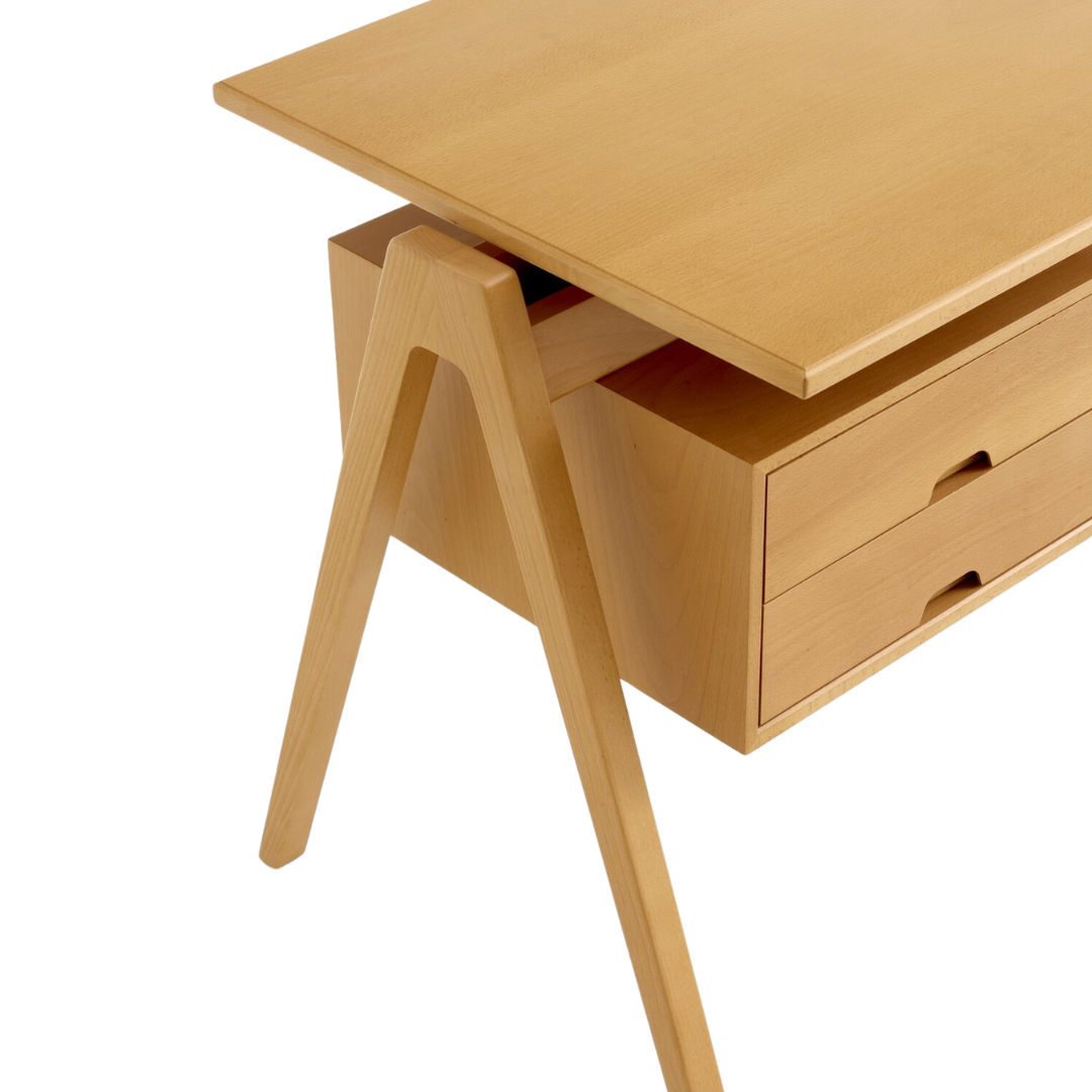 Met zijn massief beukenhouten constructie en subtiele afwerking is het bureau zowel duurzaam als elegant – een functioneel designstuk dat de tand des tijds moeiteloos doorstaat.