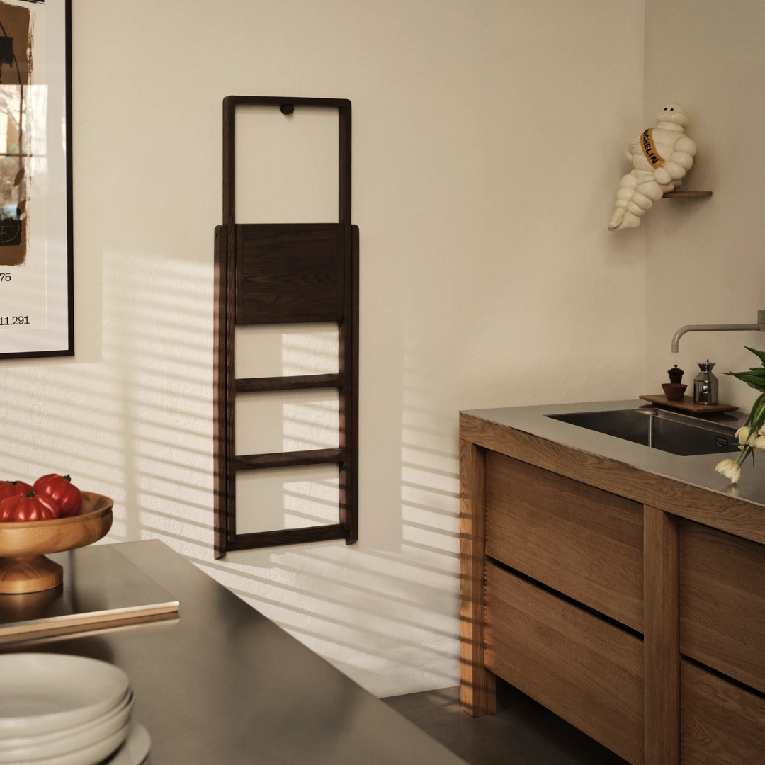 Gemaakt van massief eiken (eiken en groen variant) of de beukenhouten variant in het wit of zwart gebeitst. De ladder wordt geleverd met een haak in bijpassende materiaal en afwerking. Deze haak maakt het mogelijk om de ladder op te hangen aan de muur als een decoratieve blikvanger. Op deze manier is de ladder altijd binnen hand bereik.