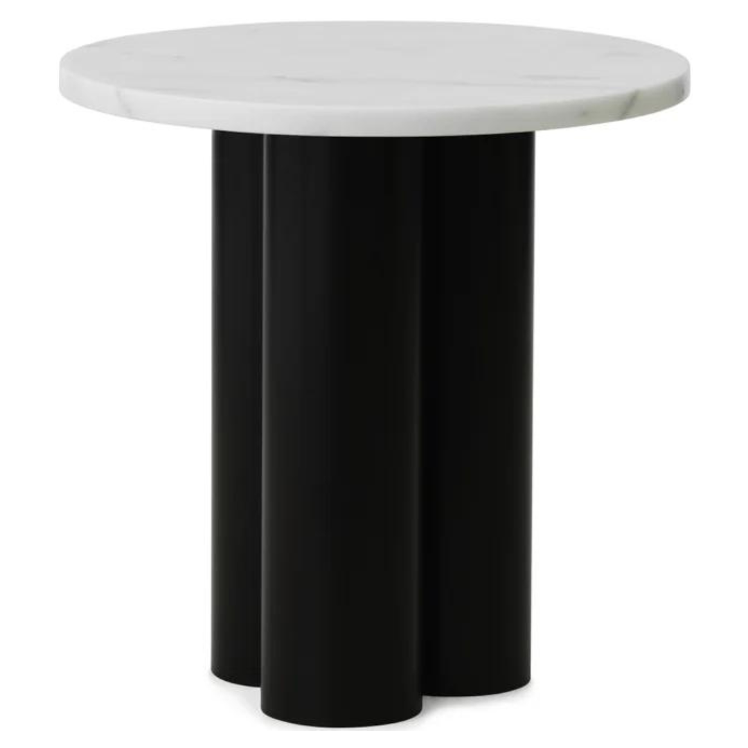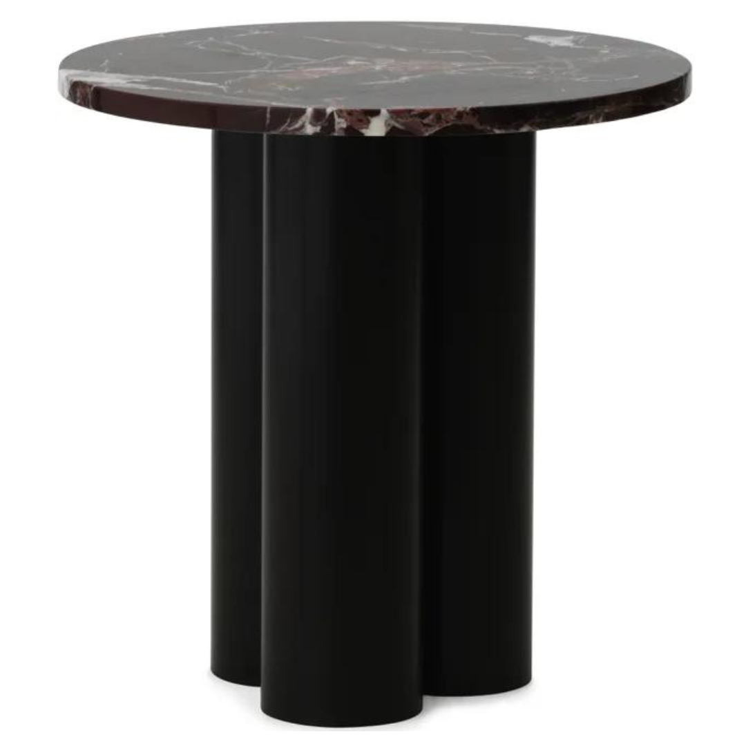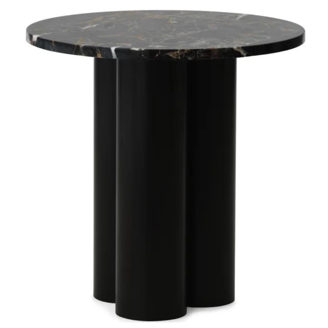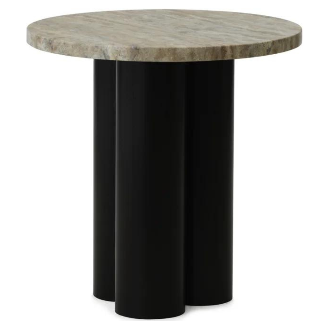 Elke Dit tafel heeft een stenen blad met een natuurlijke schoonheid, en wordt ondersteund door drie extra grote cilindrische poten van poeder gecoat staal. De tafels kunnen dienst als bijzettafeltje, basis voor een bloemstuk, of tafellamp, en als nachtkastje.
