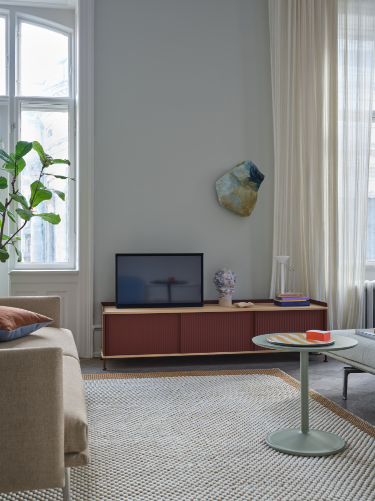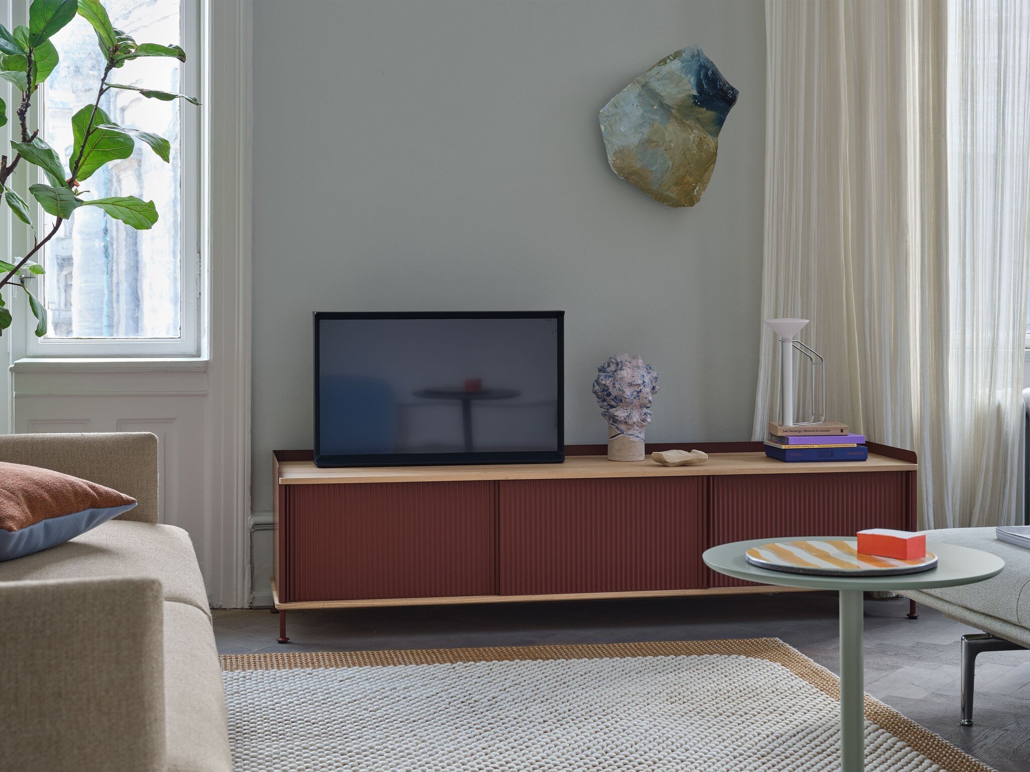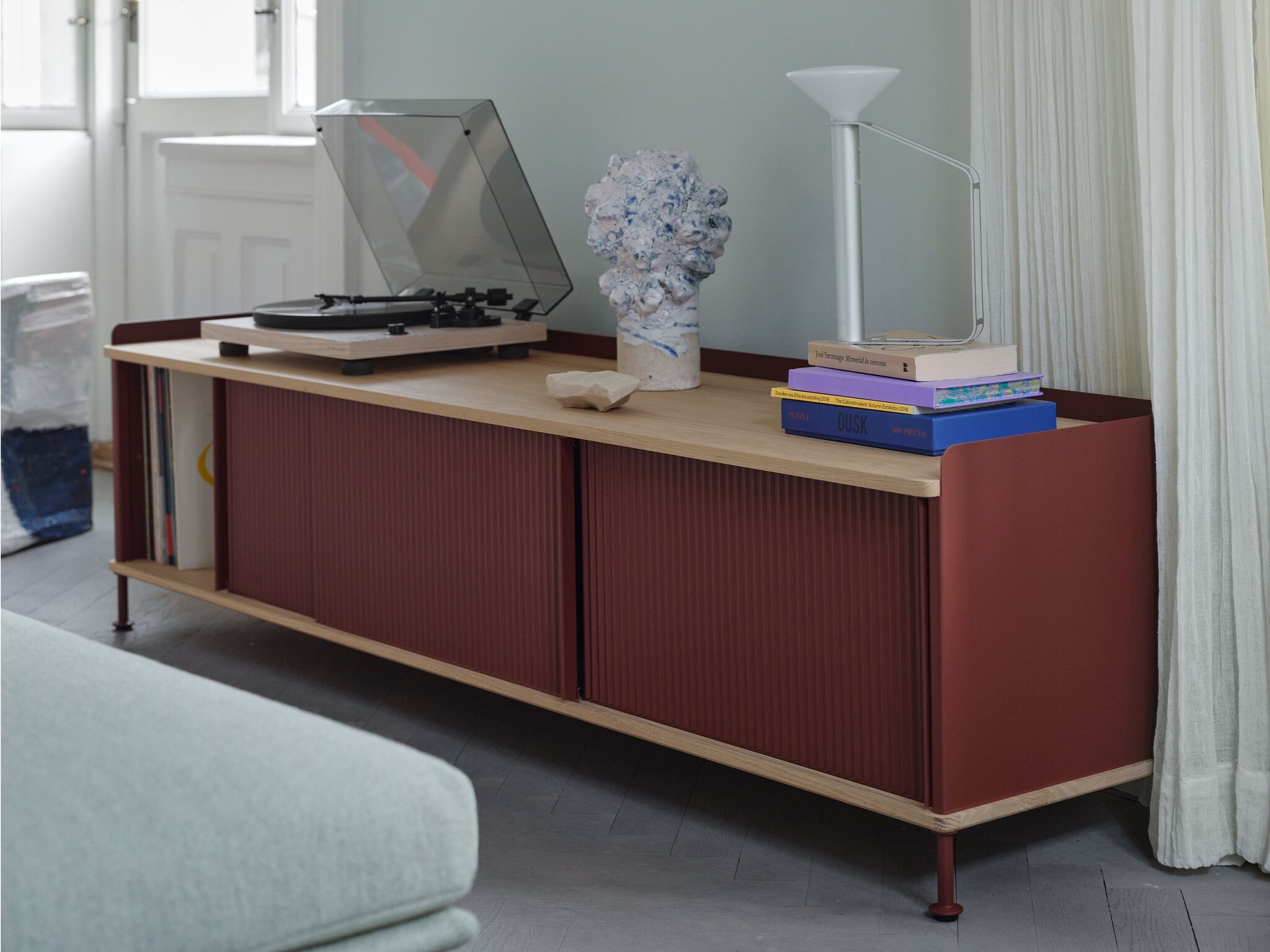 De eigentijdse Muuto Enfold kast van Thomas Bentzen is geïnspireerd op industriële fabriek kasten, beschikbaar in vier varianten voorzien van kabelopeningen. Het Enfold Dressoir combineert de houten dressoirs uit de 20e eeuw, met het hedendaagse design.