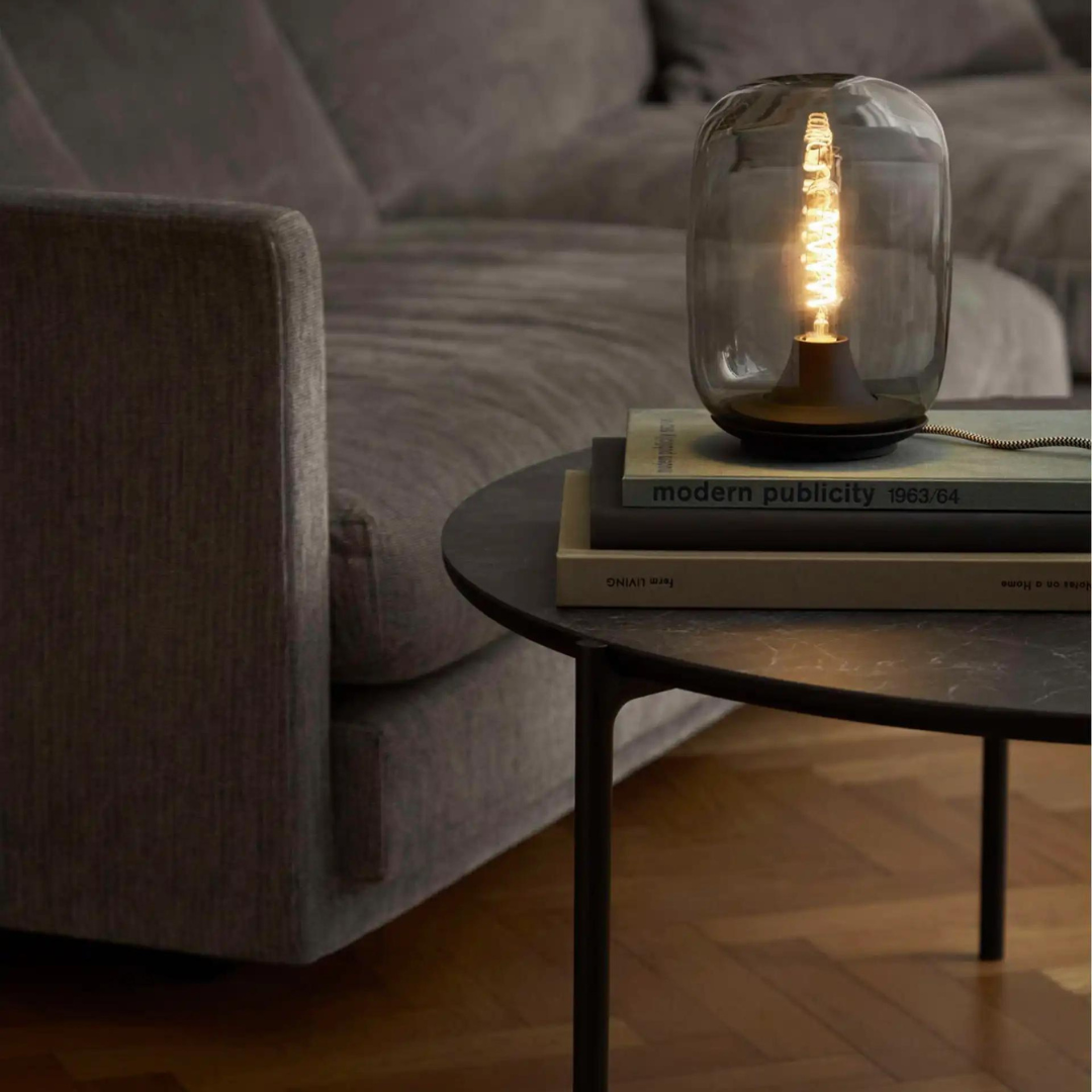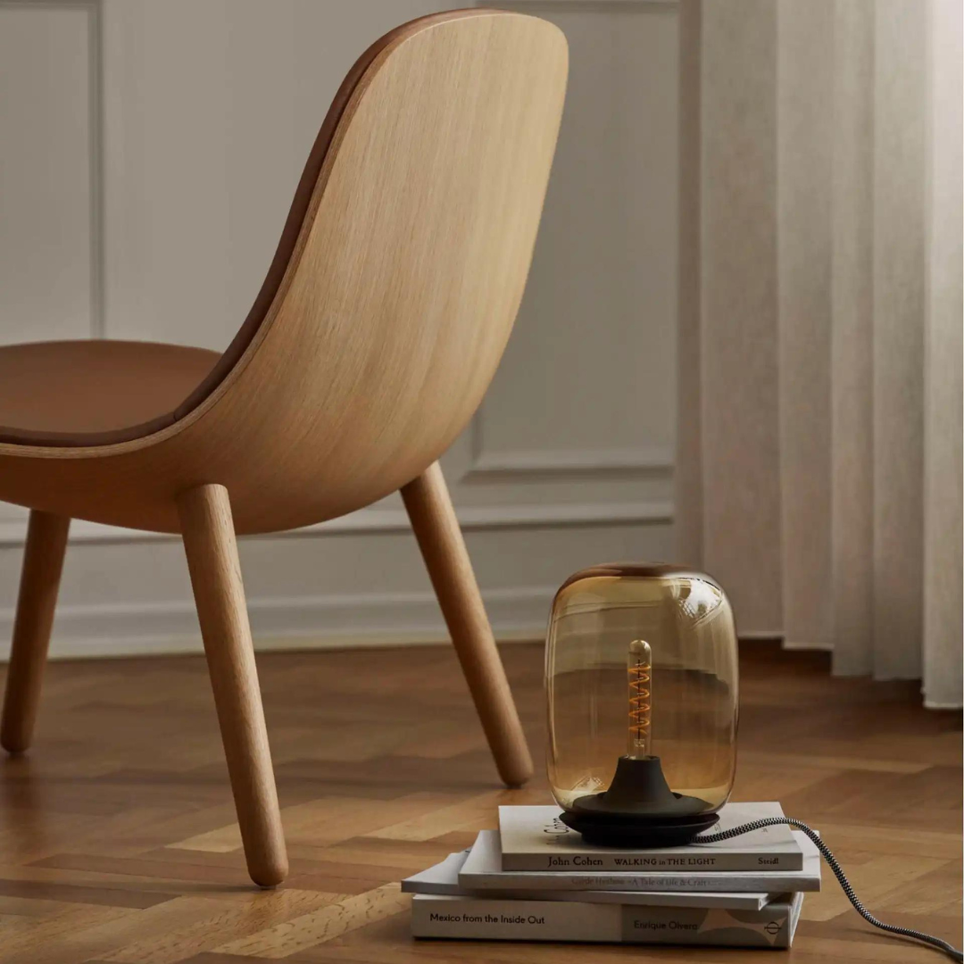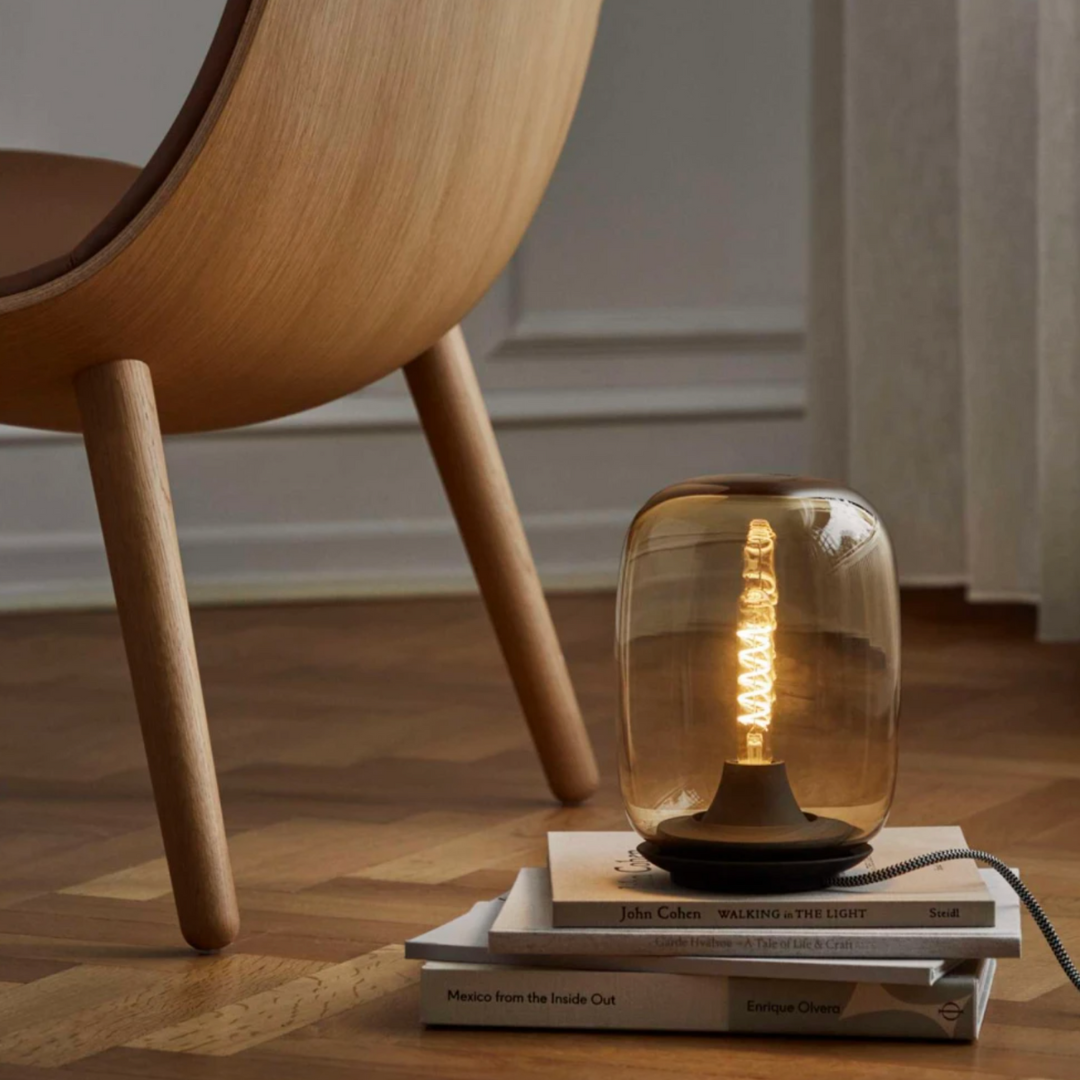 Zelfs uitgeschakeld is de Acorn Lamp een prachtig gezicht. Met zijn sculpturale lijnen, decoratieve stoffen netsnoer en praktische formaat past hij perfect op een boekenkast, vensterbank of nachtkastje. De elliptische glazen kap en de LED-lamp met spiraalvormige gloeidraad zorgen voor een zachte, zachte verlichting, zoals de gezellige gloed van kaarslicht. Om de sfeer te veranderen, pas je eenvoudig de helderheid aan met de dimmerschakelaar. De lamp heeft een indrukwekkende levensduur van 20.000 uur. Dit betekent dat als u de lamp nooit uitdoet, u de lamp 2,5 jaar lang niet hoeft te vervangen.