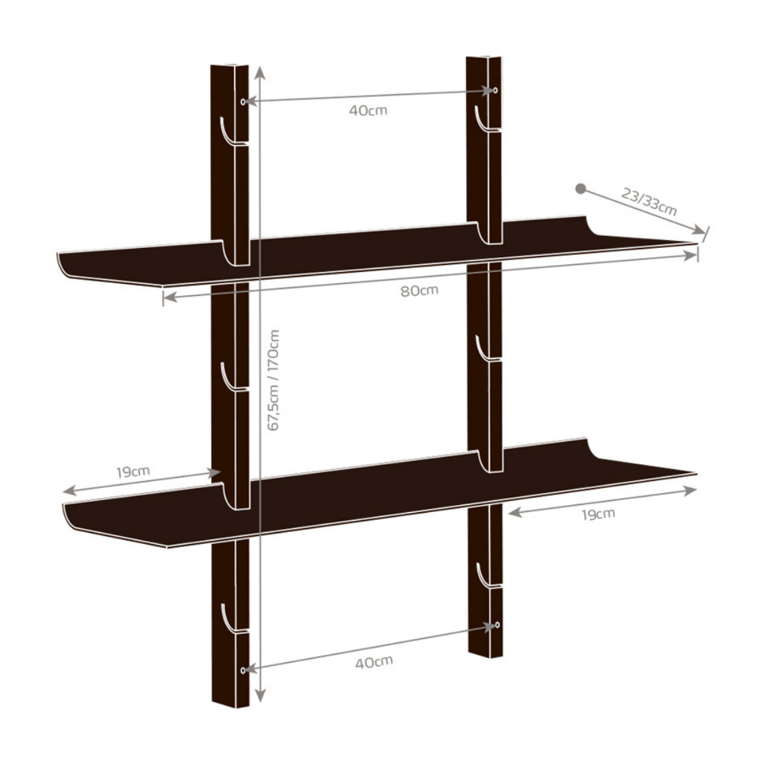 Deze set bestaat uit twee korte zijsteunen van 70 cm en twee legplanken van 79,6 cm breed en 20 cm diep.