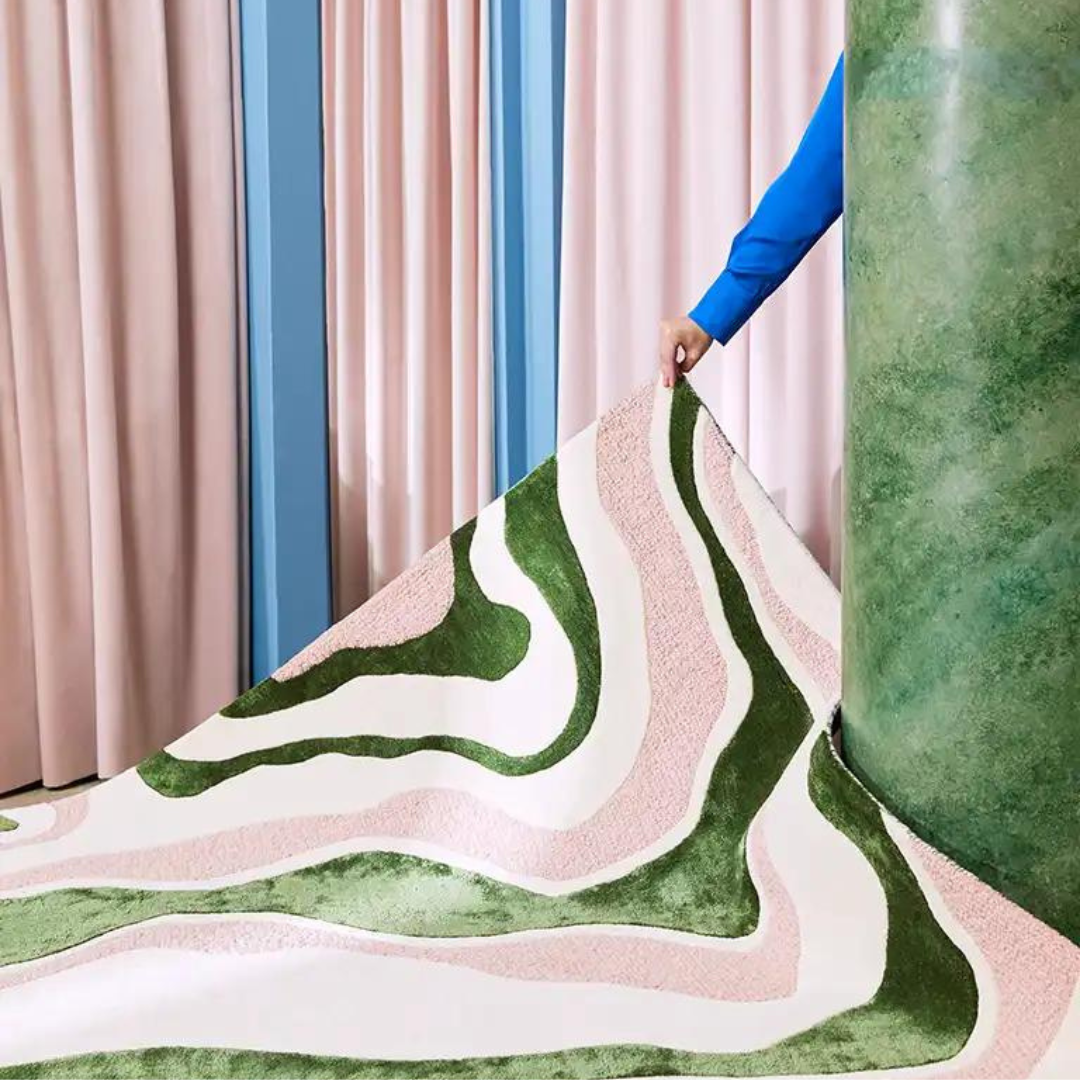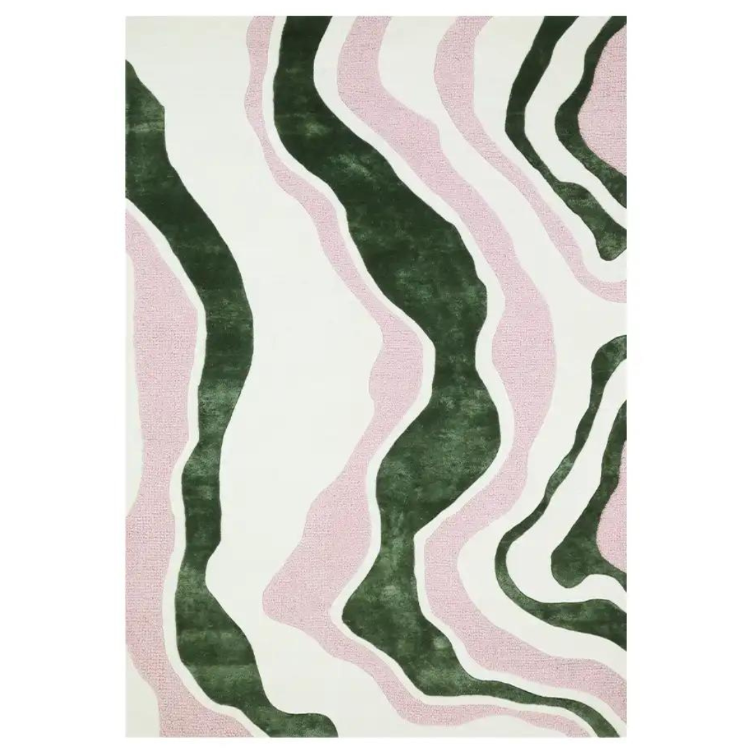 De Virta van het Finse Finarte is een luxe tapijt dat witte en roze wol combineert met licht glanzende groene tencel.