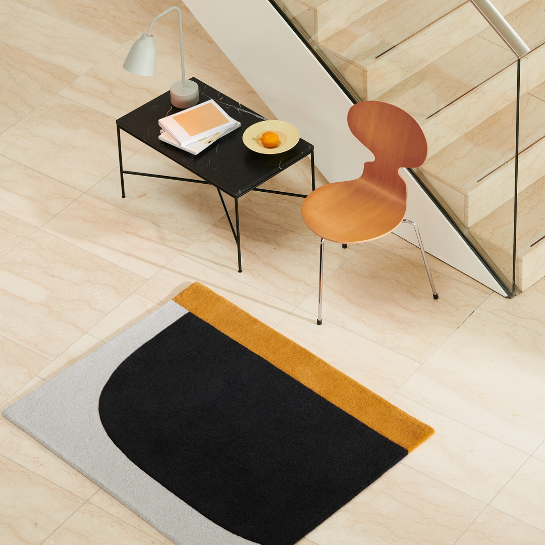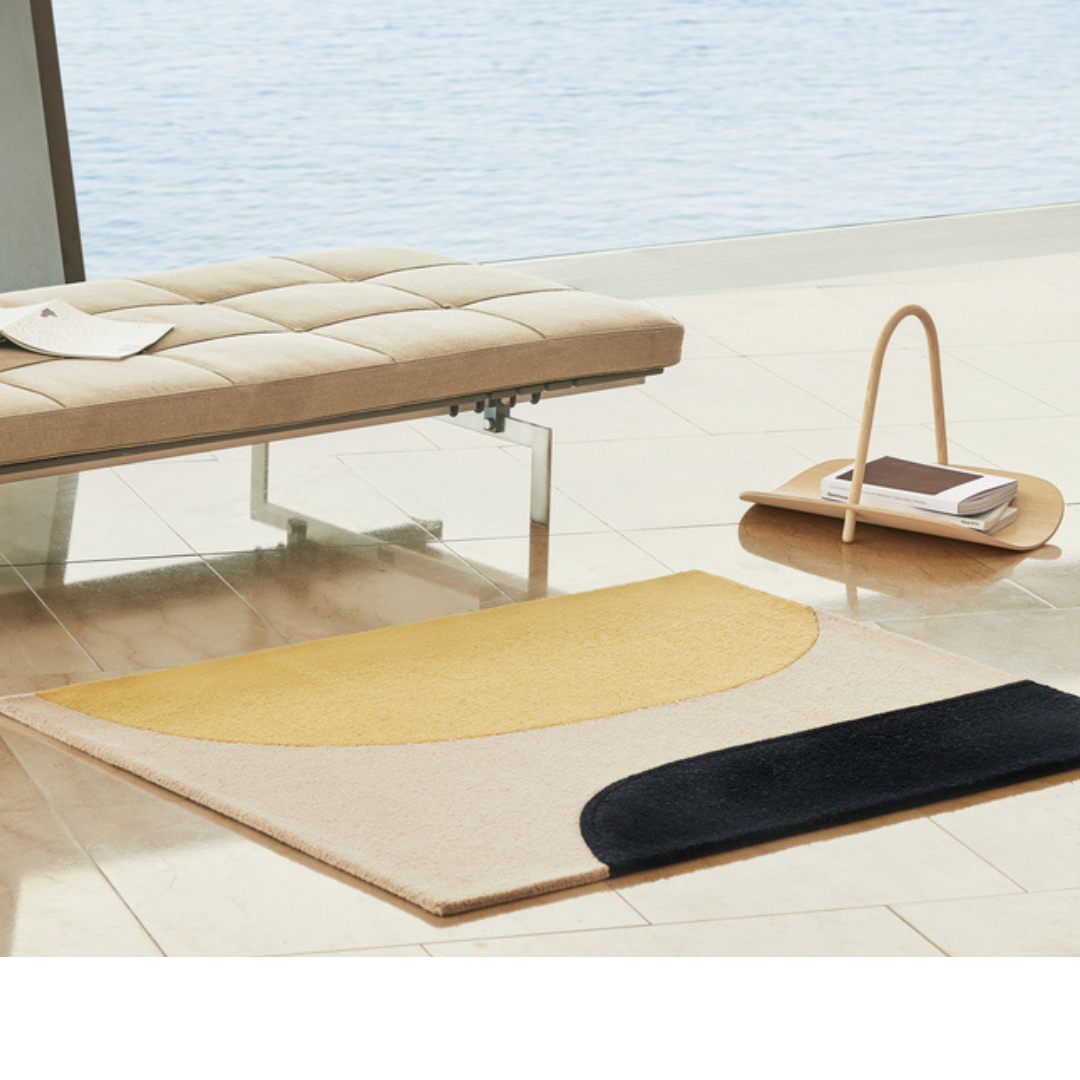 De ontwerpster Cecilie Manz haalde inspiratie voor het vloerkleed uit haar eigen studio: door het patroon van het vloerkleed deze toont schaduwen op de vloer, zoals haar eigen tekeningen en geometrische papieruitsparingen die in stapels op haar bureau staan.