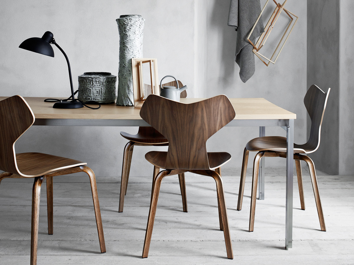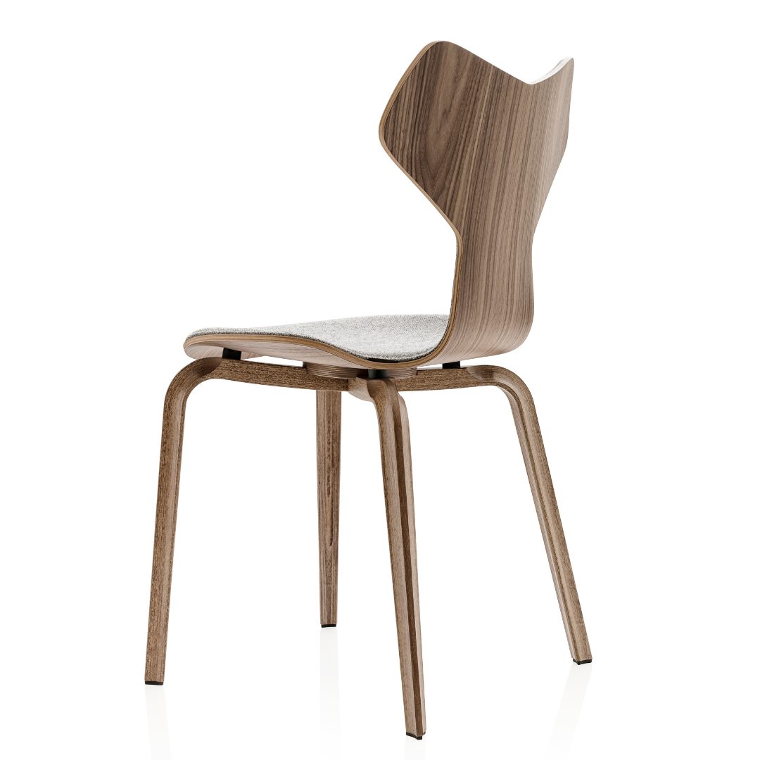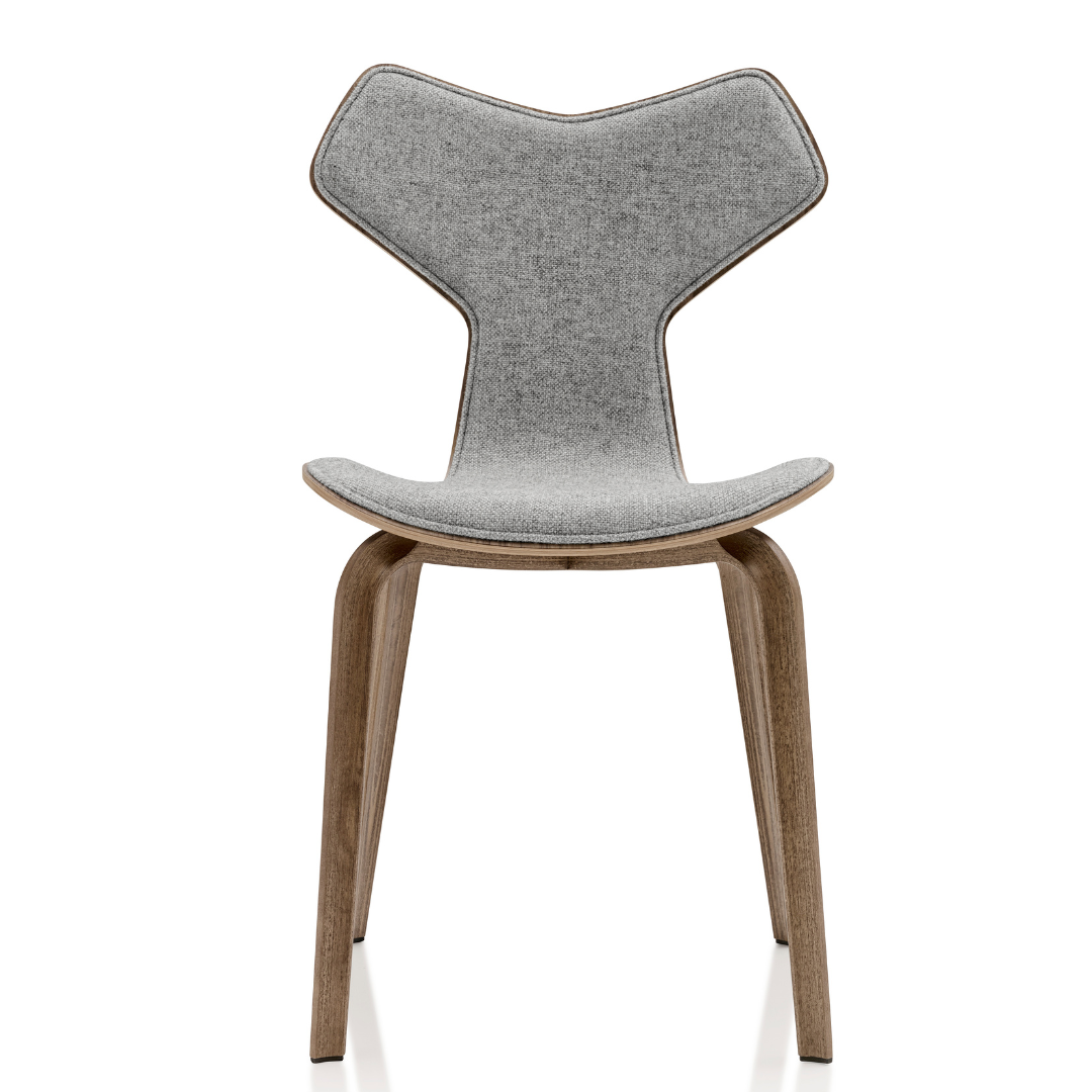 De Grand Prix wordt geleverd in twee verschillende fineren: eiken en walnoot met heldere, blanke lak laag. Zitschaal gemaakt van onder druk gegoten/ gesneden houtfineer met houten poten. Bekleding voorkant Kvadrat Hallingdal 130 grijs