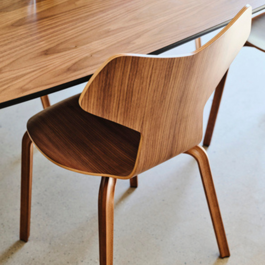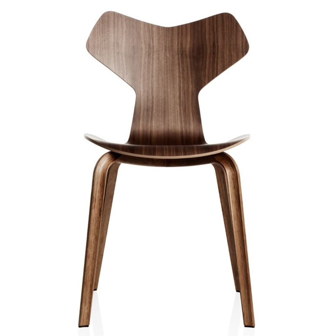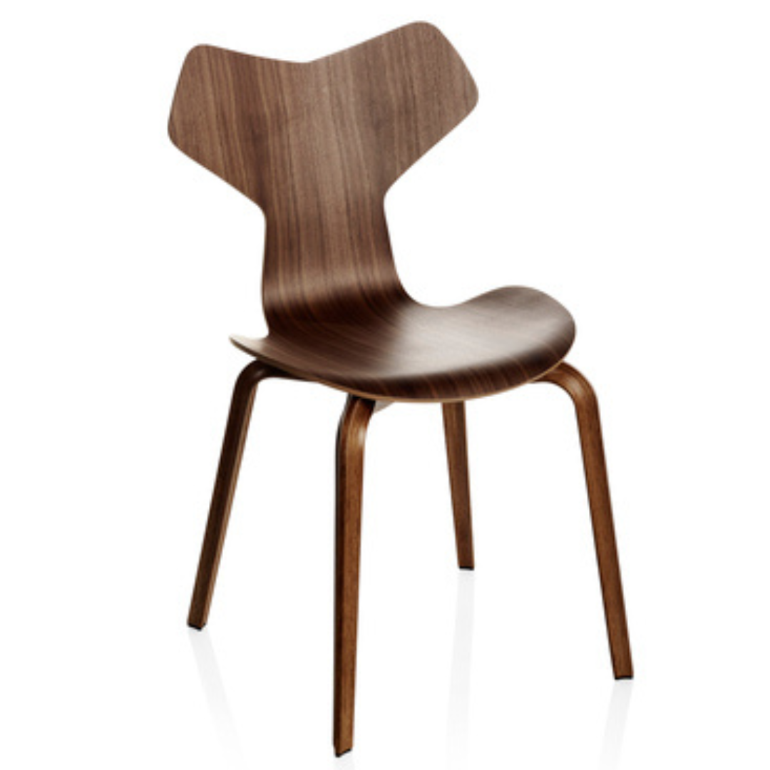 De Grand Prix wordt geleverd in twee verschillende fineren: eiken en walnoot met heldere, blanke lak laag. Zitschaal gemaakt van onder druk gegoten/ gesneden houtfineer met houten poten. Bekleding voorkant Kvadrat Hallingdal 130 grijs