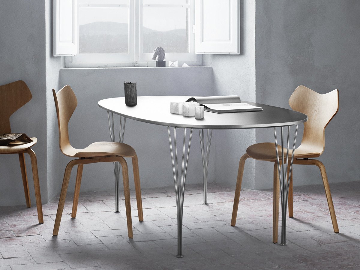De Fritz Hansen Grand Prix eetkamerstoel, ontworpen door de bekende Deense ontwerper Arne Jacobsen in 1957, heeft een gedurfde, geometrische vorm.