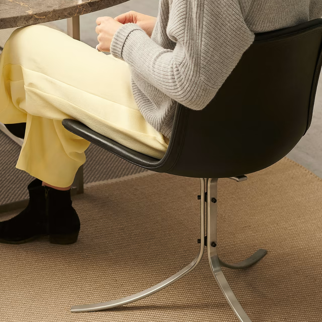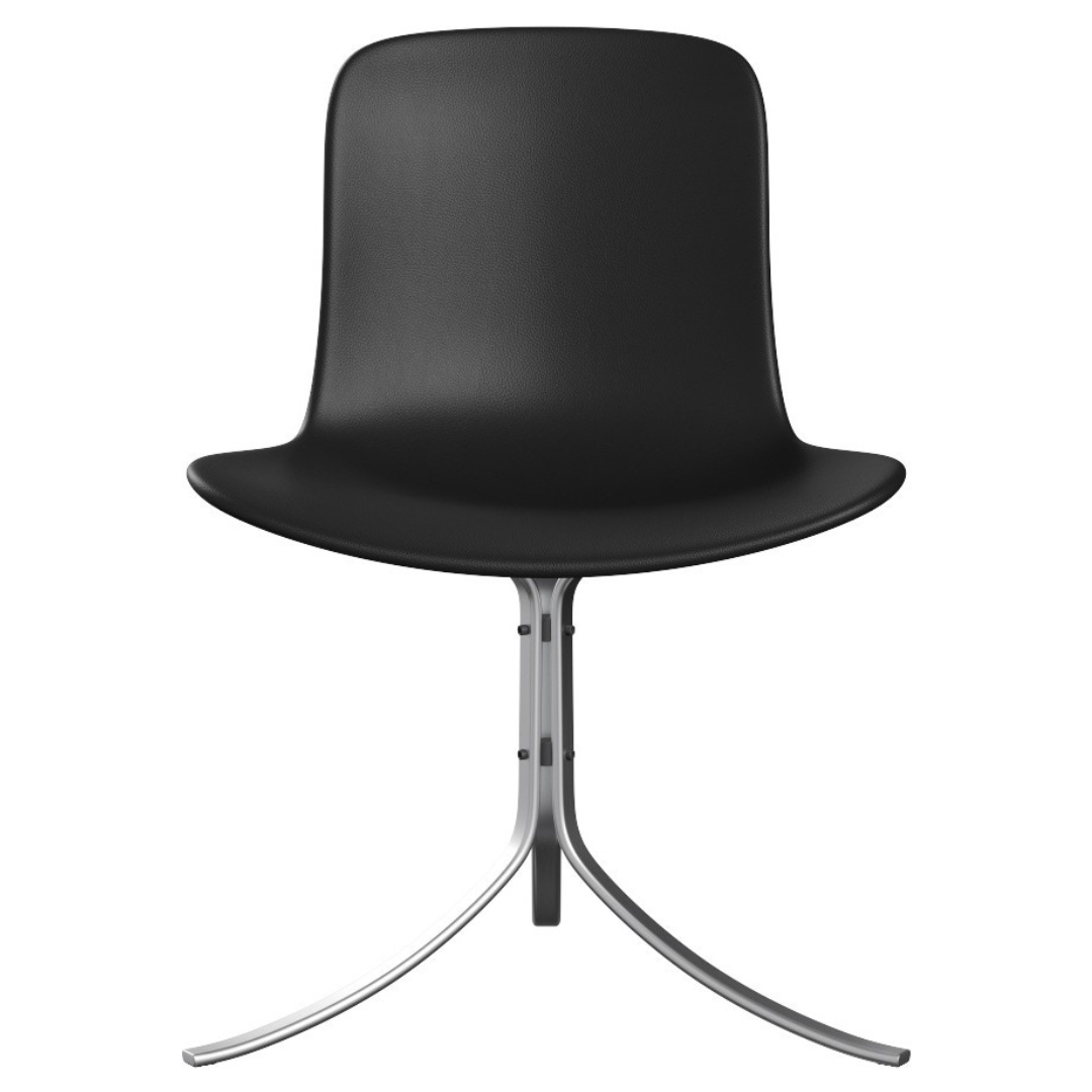 De unieke vorm van de PK9-stoel wordt gekenmerkt door de kolomvoet gemaakt van drie stukken gesatineerd roestvrij staal die de lederen zitschaal ondersteunen.