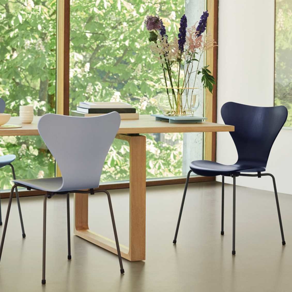 De iconische 7 serie eetkamerstoelen in monochrome, ontworpen door Arne Jacobsen in 1955, zijn de klassiekers van Fritz Hansen.