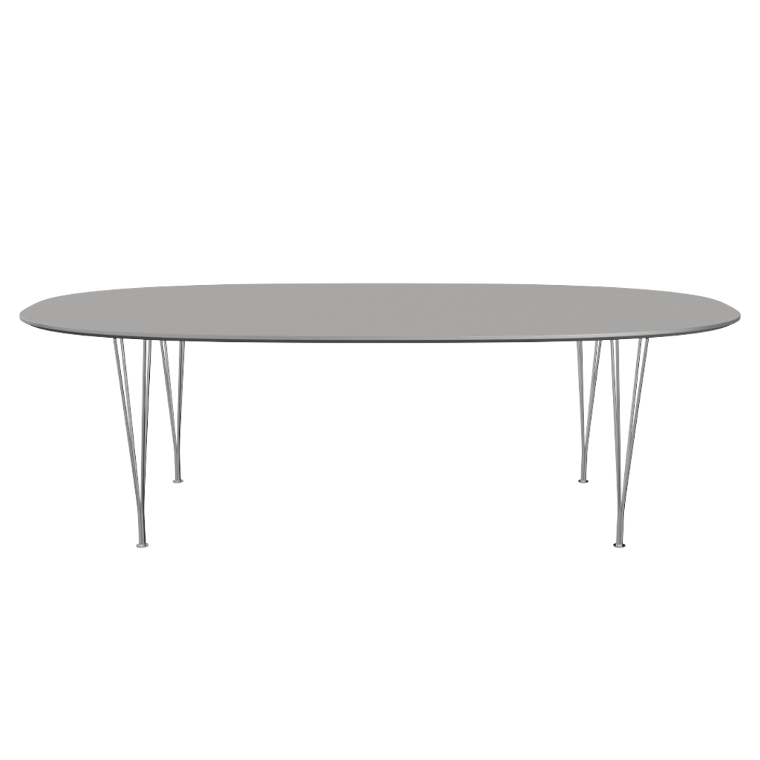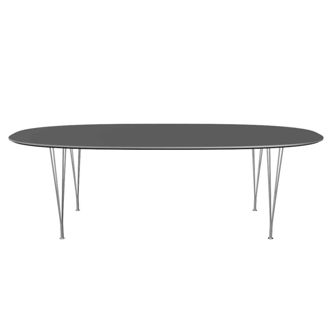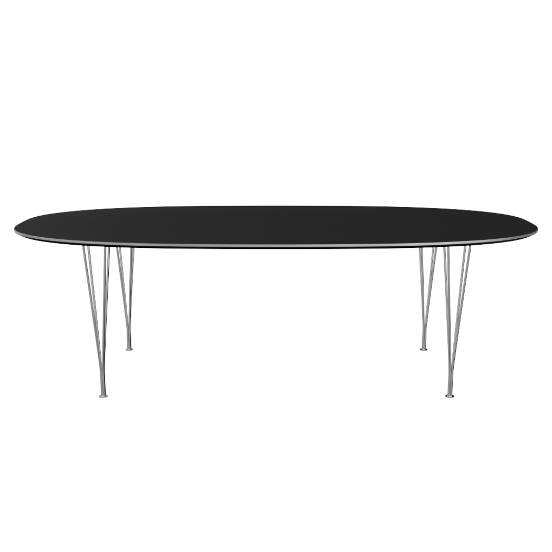 De moderne en luchtige B614 Superellipse tafel van Fritz Hansen is ontworpen door Arne Jacobsen, Piet Hein & Bruno Mathsson en bekend om zijn iconisch onderstel.
