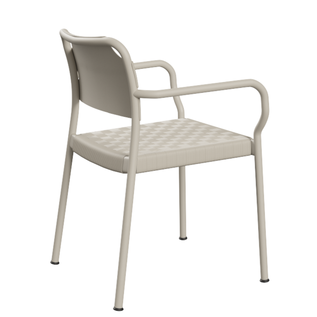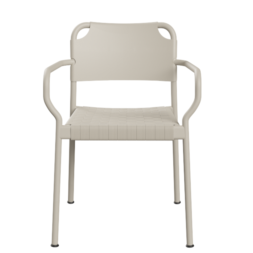 De stoel heeft een slank frame van poeder gecoat aluminium en een met de hand geweven zitting van sterk polyesterkoord. Het minimalistische ontwerp zonder armleuningen benadrukt de luchtige uitstraling van de stoel, terwijl het tegelijkertijd zorgt voor comfort en flexibiliteit. Dankzij het lichte gewicht en het stapelbare ontwerp is de Vind-stoel ideaal voor terrassen, tuinen en horeca omgevingen.