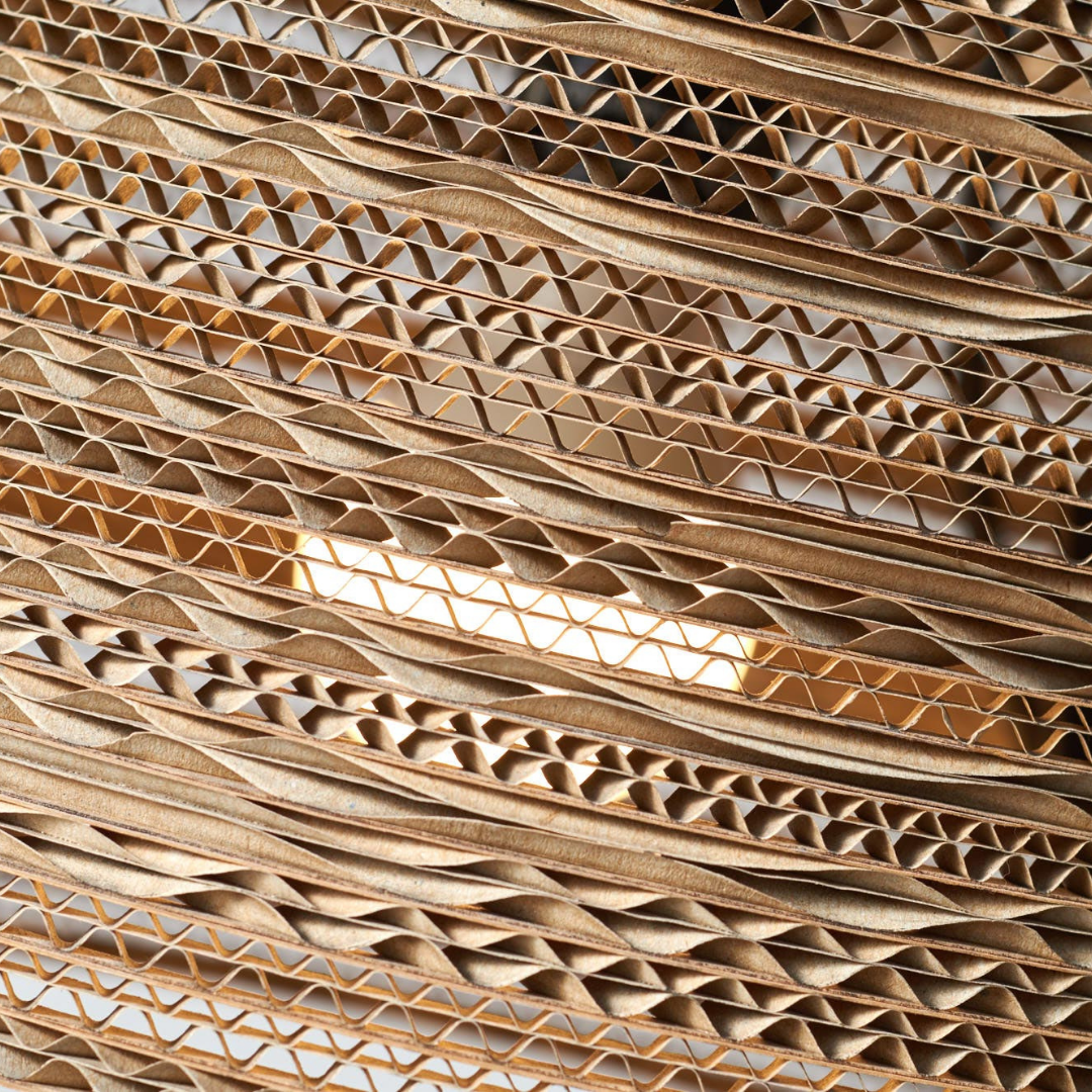 De ribbels van de ronde kartonnen kap van de lamp filteren het licht op een fascinerende manier en geven de lamp een unieke textuur en uitstraling, ook als deze is uitgeschakeld.