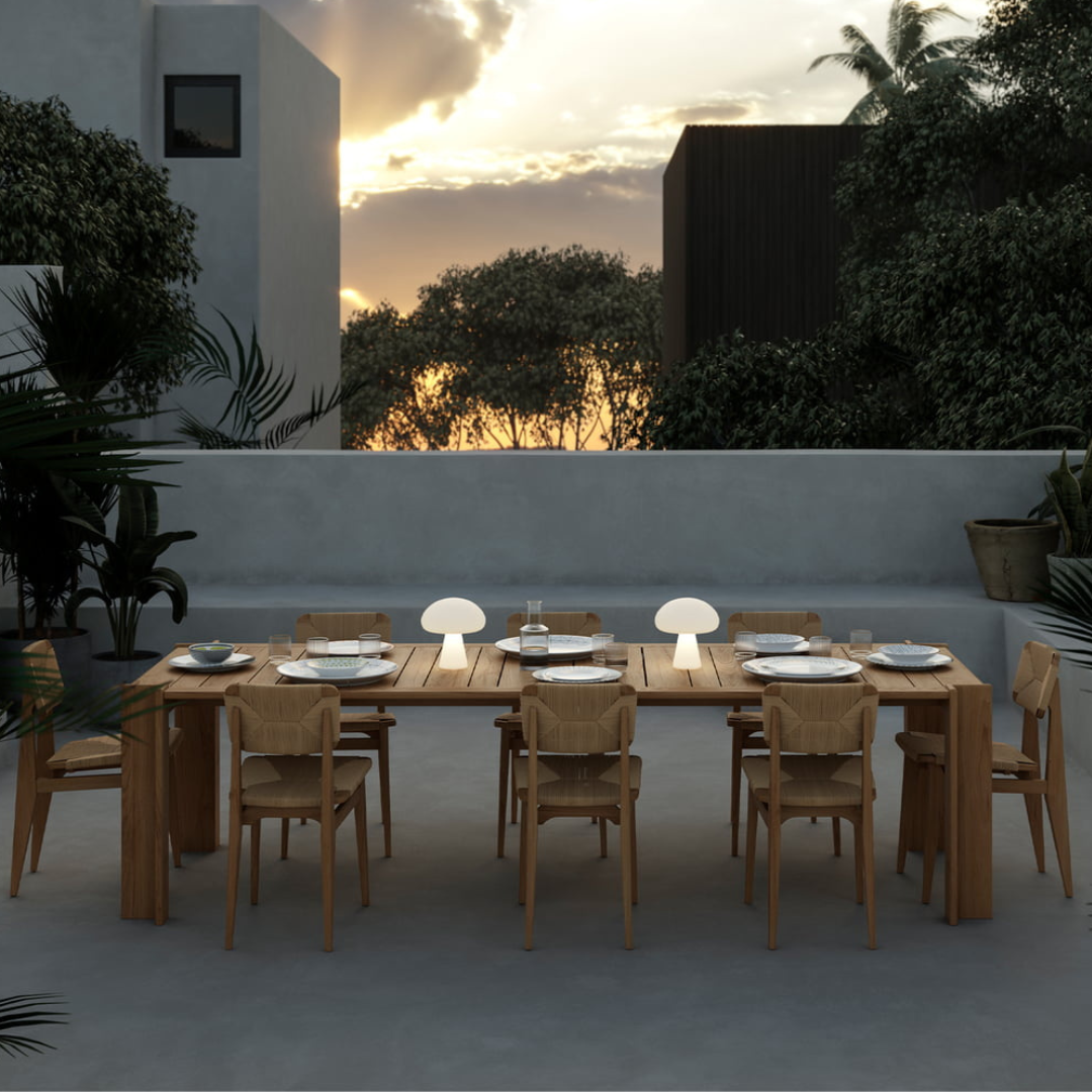 De Atmosfera tafel is gemaakt van teakhout en bestaat uit een fascinerend asymmetrisch latten boven blad en L-vormige poten die er iets boven uitsteken, waardoor het geometrische ontwerp een zachte, vriendelijke toets krijgt. Door de plaatsing van de poten is er voldoende zitruimte, waardoor Atmosfera ideaal is voor zes personen.