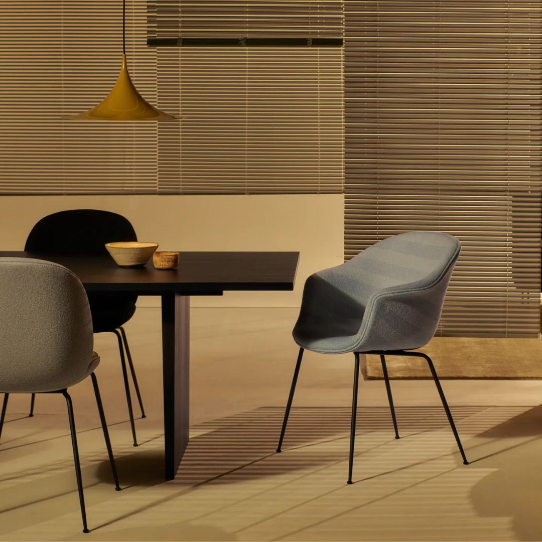 Door het brede aanbod aan stoffeer-opties en verschillende onderstellen past de Bat Dining Chair perfect in zowel openbare (horeca) als in een privé omgeving.
