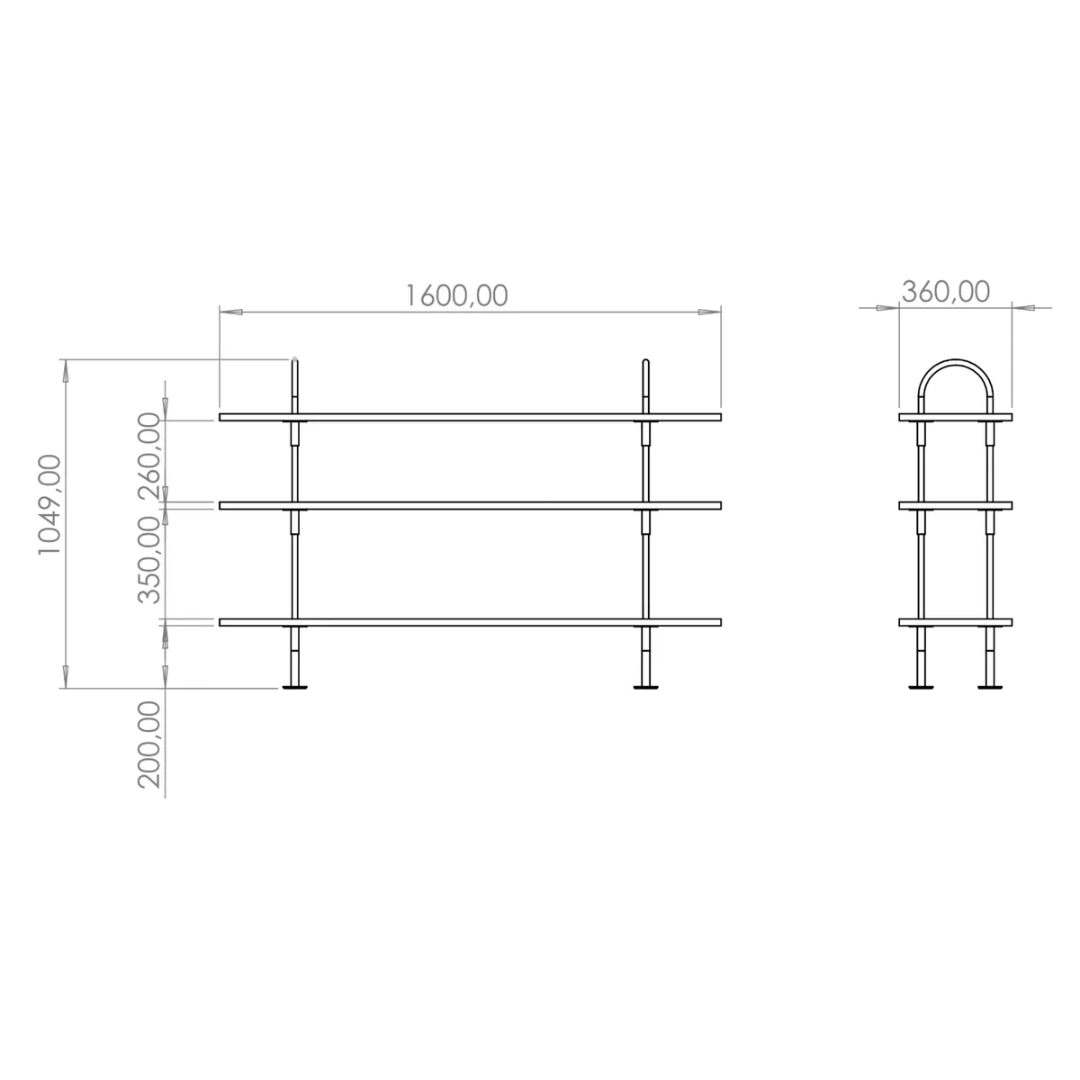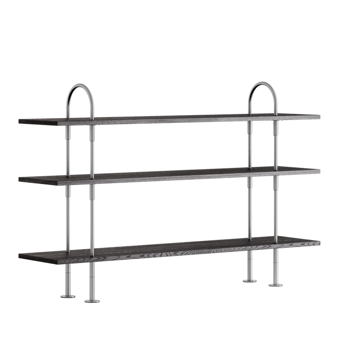 Het modulaire ontwerp bestaat uit een slim samenspel van roestvrijstalen dragers en houten legplanken, die samen een harmonisch evenwicht creëren tussen industriële precisie en natuurlijke tactiliteit. Dankzij het vergrendelende systeem kan de opstelling zowel verticaal als horizontaal worden uitgebreid, waardoor oneindig veel configuraties mogelijk zijn – van open wandmeubel tot architecturaal roomdivider.