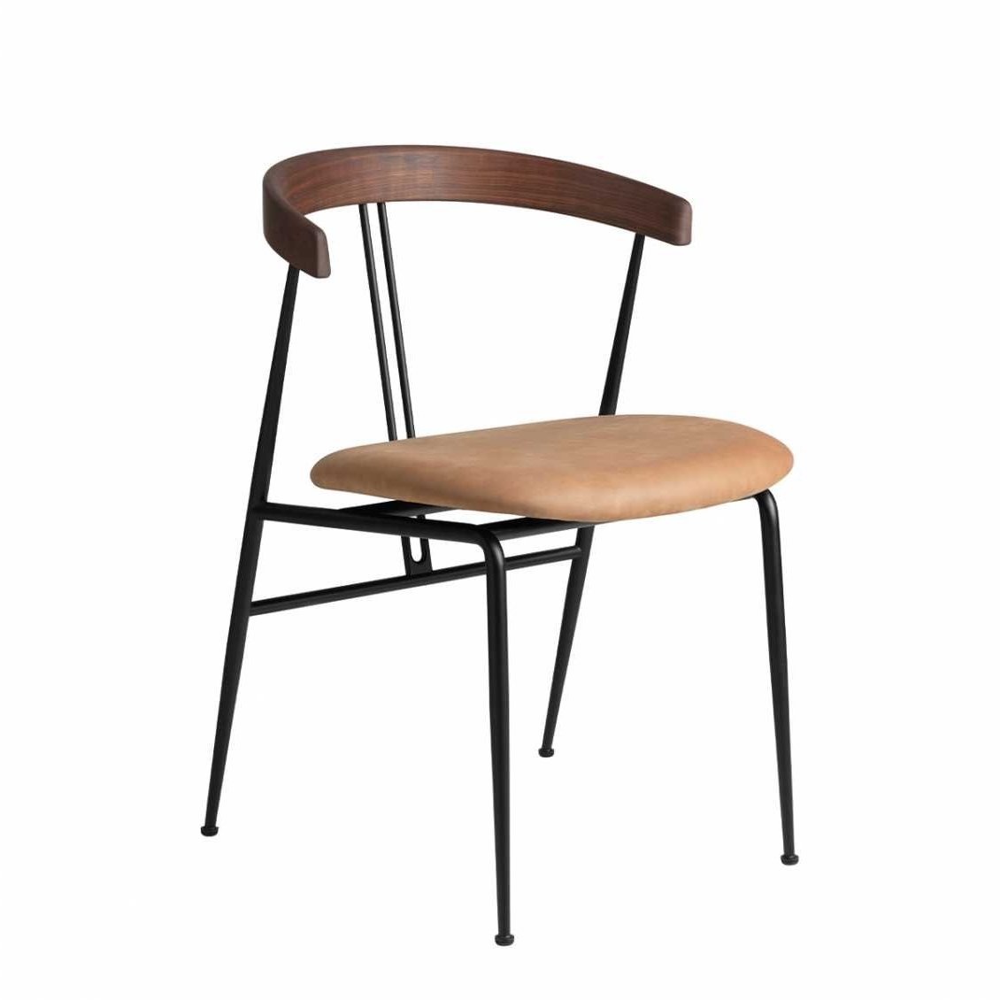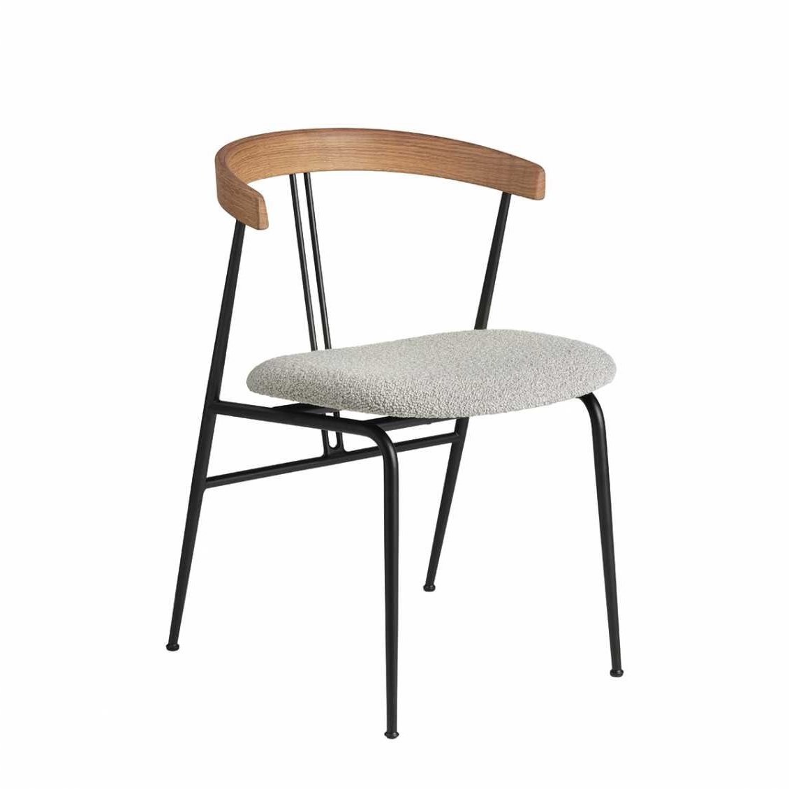Materiaal: mat zwart poeder gelakt staal, houten rugleuning in geolied walnoot of geolied eiken.