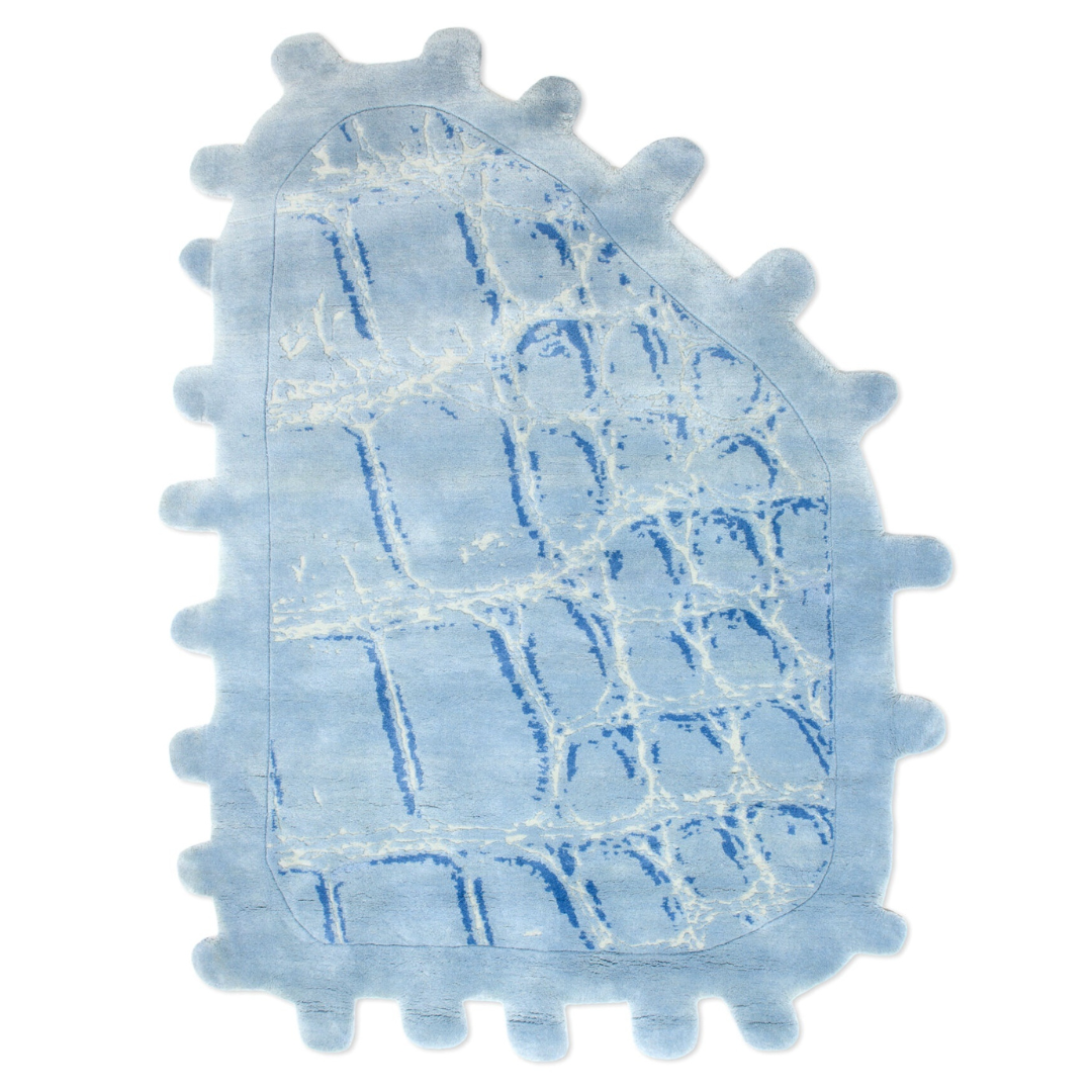 Een koel palet van blauwtinten, variërend van luchtig lichtblauw tot diepe oceaanaccenten, vormt de basis. Het oppervlak wordt met de hand uitgesneden, waardoor een patroon van organische, reptiel-achtige schubben ontstaat. De onregelmatige contour versterkt het natuurlijke gevoel en maakt van het kleed een artistiek statement.