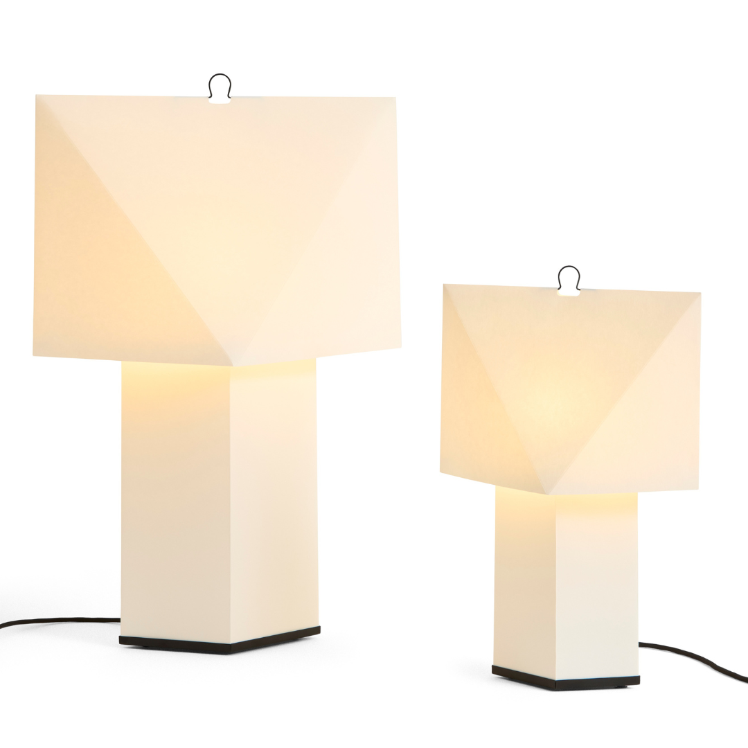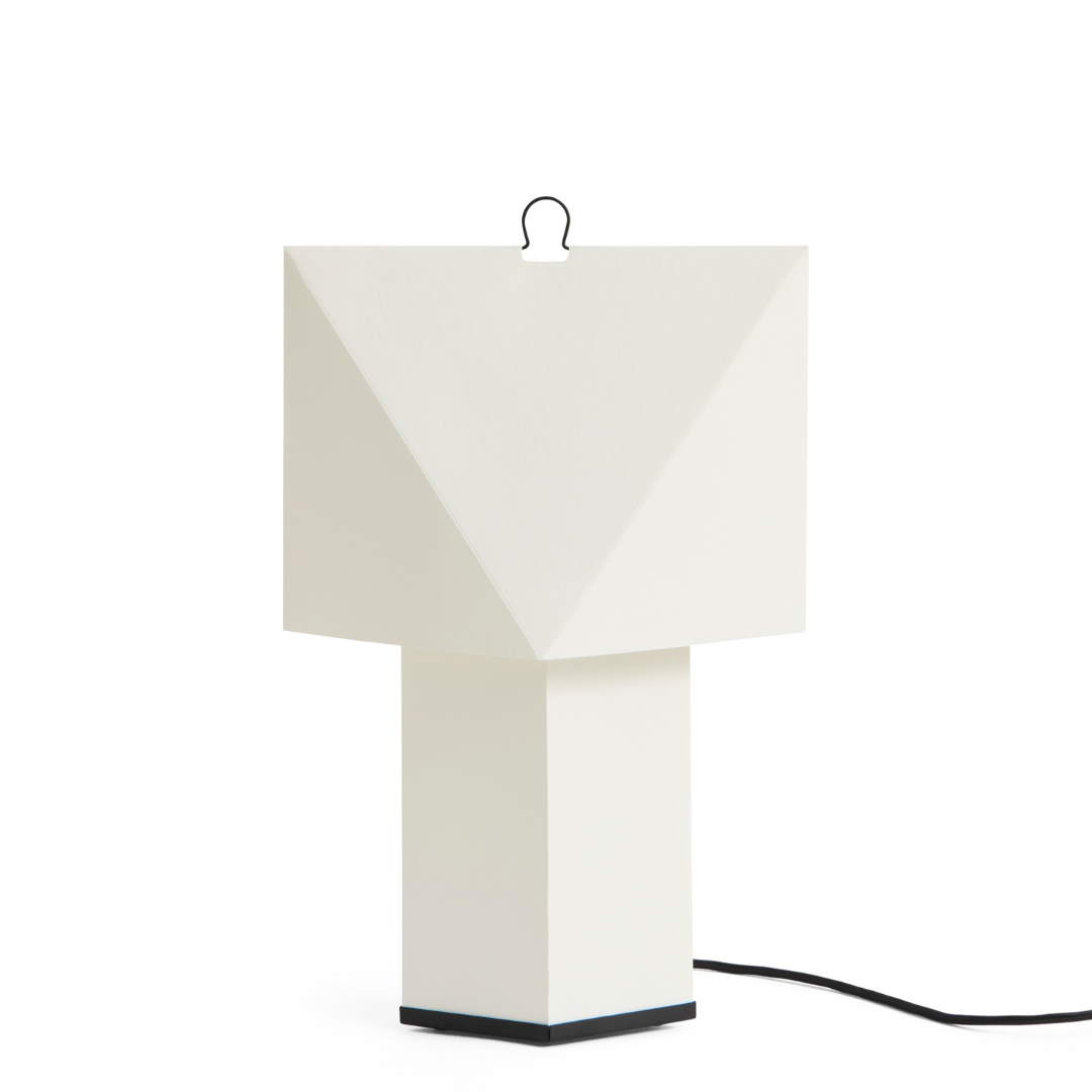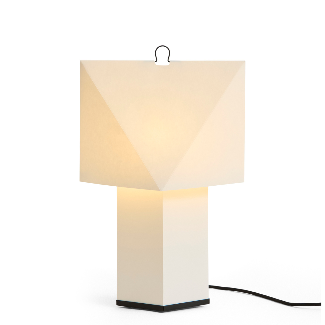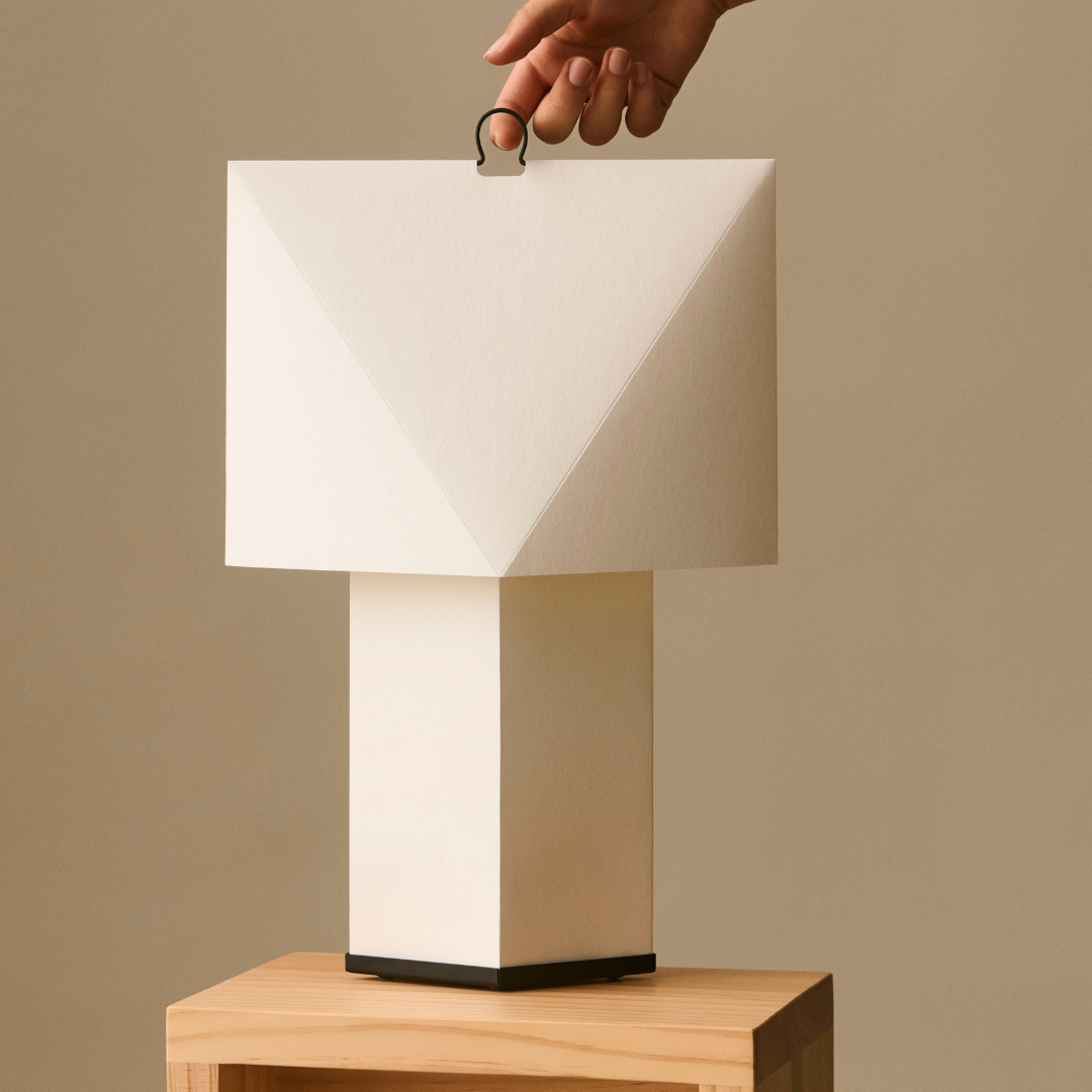 De Aplat tafellamp, ontworpen door het Franse designduo CPRV, is een lichtgewicht, sculpturale lamp die voornamelijk is vervaardigd uit gevouwen papier. Het plat verpakte ontwerp wordt door de gebruiker zelf in elkaar gezet, waarbij precieze lijnen en hoeken volume creëren en de lamp een eenvoudige, grafische vorm geven. Het diffuse papieroppervlak verspreidt een zachte gloed die doet denken aan kaarslicht, wat warmte en sfeer toevoegt aan de omgeving. De minimalistische constructie, gecombineerd met een discrete metalen haak, maakt de lamp licht en gemakkelijk te verplaatsen naar elke gewenste plek. Verkrijgbaar in twee maten, past de lamp zich gemakkelijk aan de meeste ruimtes aan – op tafels, planken en vensterbanken, of als staande lamp in elke kamer.