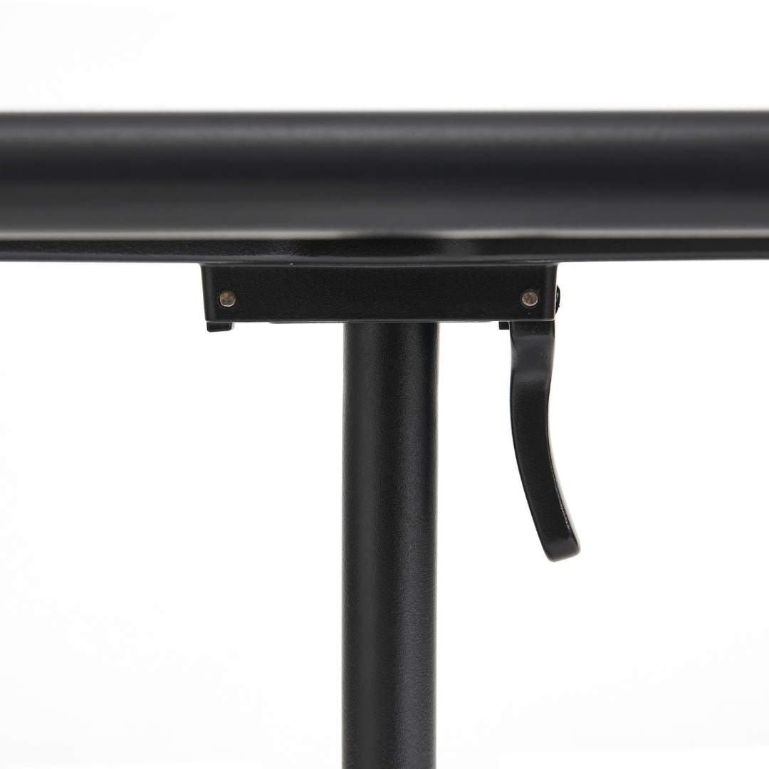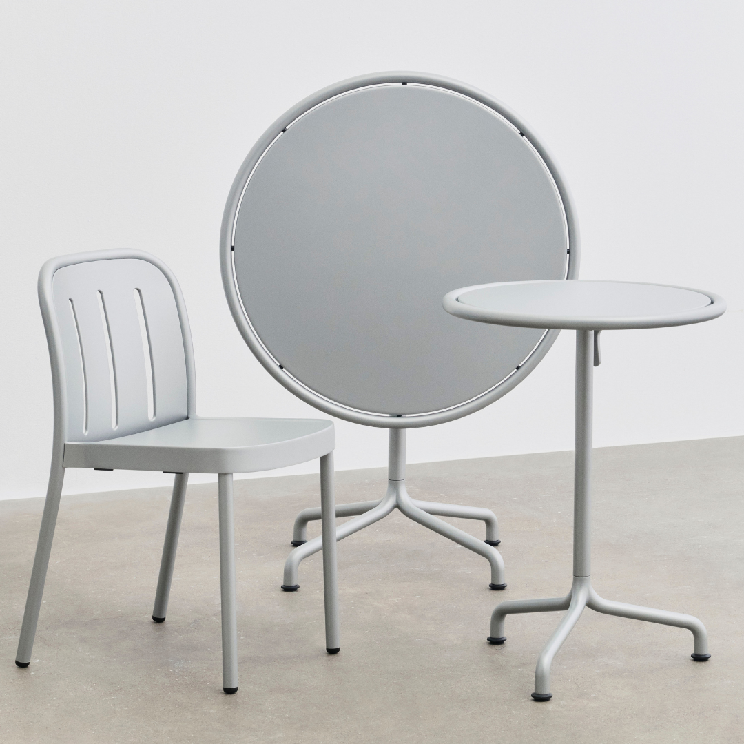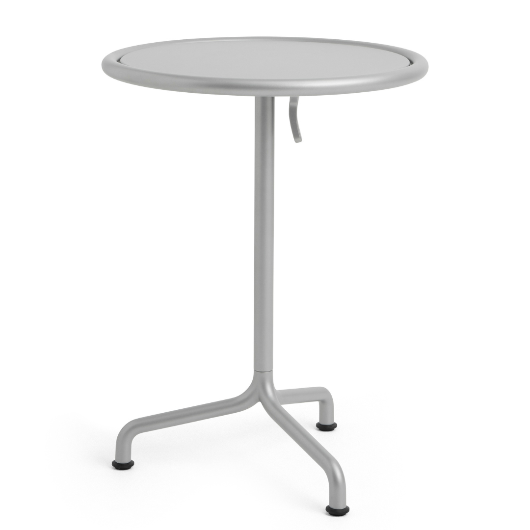 De tafel is vervaardigd uit minimaal 60% gerecycled aluminium, waardoor hij roestbestendig, duurzaam en licht van gewicht is. Het kantelbare tafelblad maakt de Deville bistrotafel bijzonder praktisch: eenvoudig te verplaatsen, op te bergen of efficiënt te stapelen wanneer de ruimte daarom vraagt.